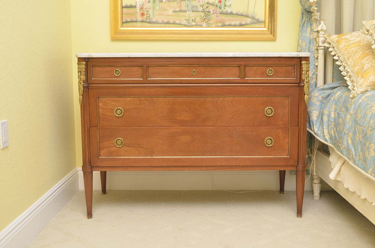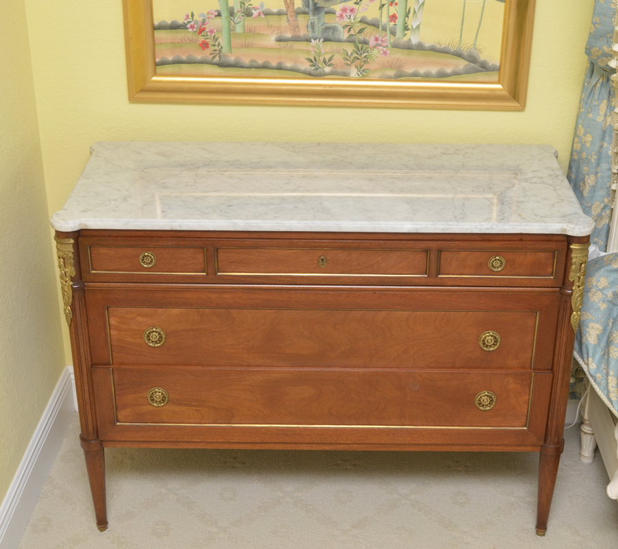 FRENCH MARBLE TOP DRESSER: Variegated white marble top with cookie corners, 3 full length drawers, fluted stiles, applied gold decorated metal mounts, tapered legs. Overall measures 36'' h. x 49'' x 21''.
