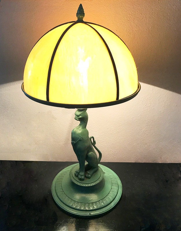 VINTAGE ART DECO ERA SLAG GLASS CAT LAMP: Cast metal base with a full bodied Egyptian motif green cat sitting under a domed caramel slag glass shade. 19'' h, 10'' dia shade.