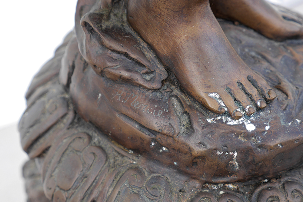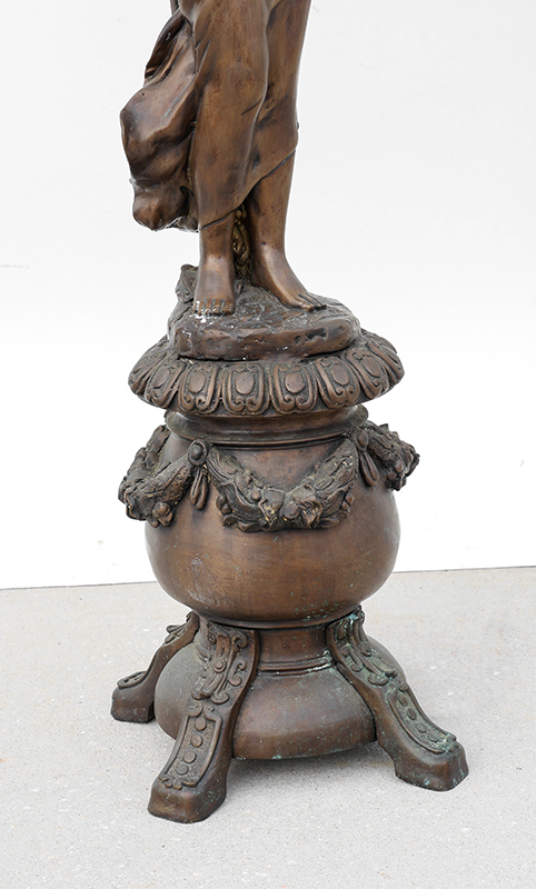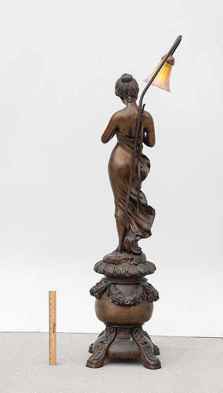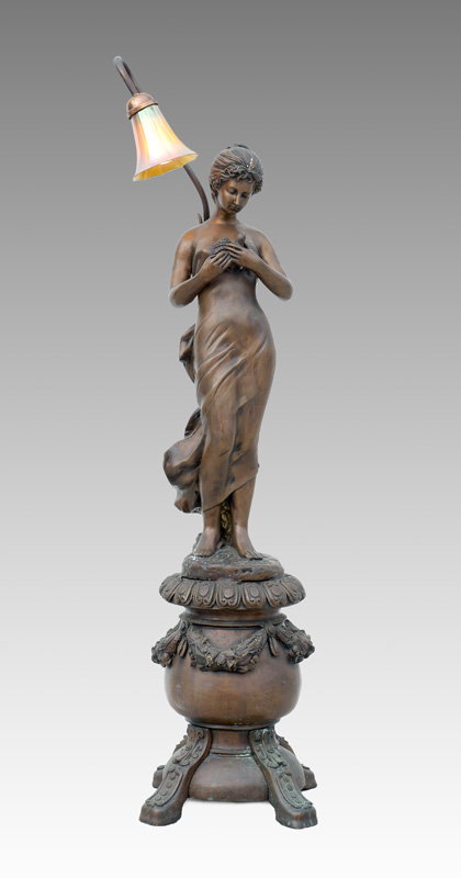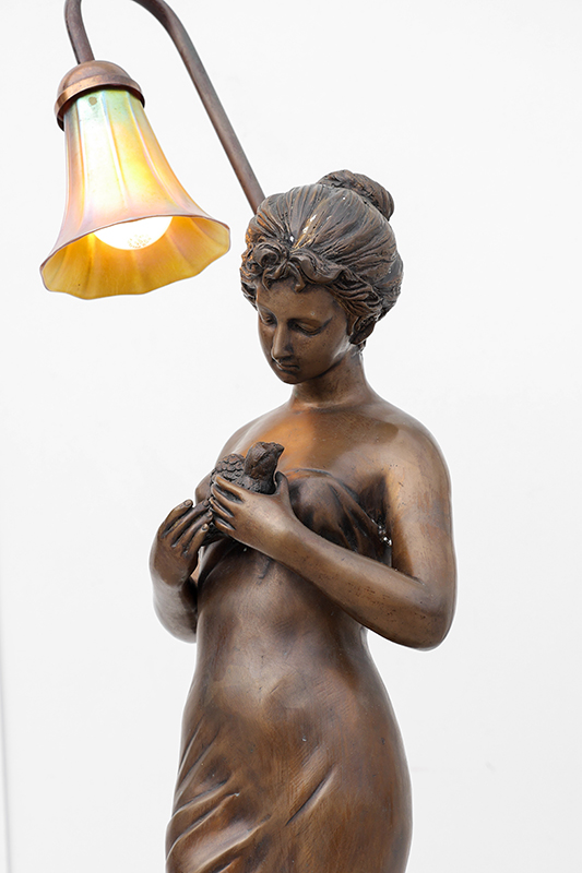BRONZE FIGURAL WOMAN LAMP SIGNED MERCIE: 20th century production, figural maiden holding a dove, flowing robes, standing on a urn form base, signed A. Mercie with signed Steuben floriform shade. Overall measures 54'' h. x 17''.