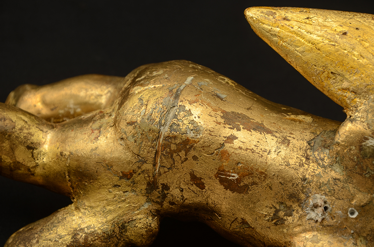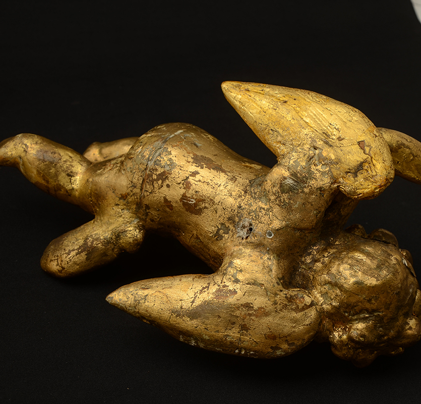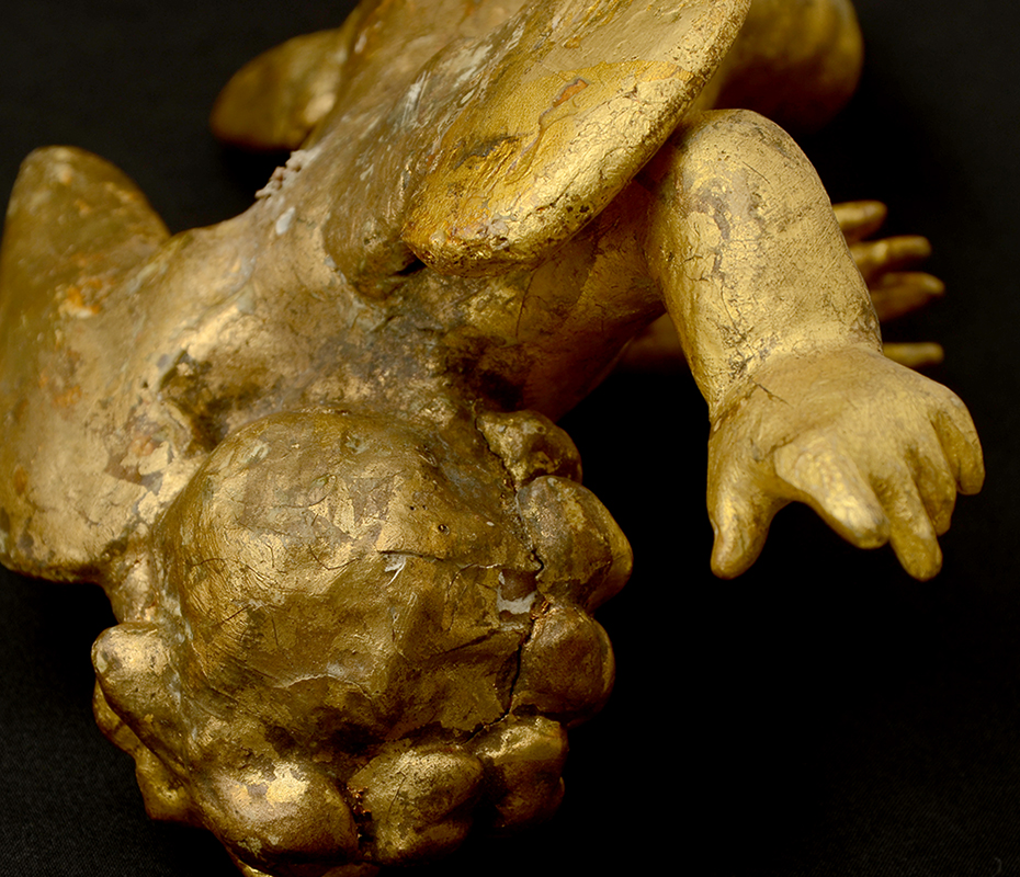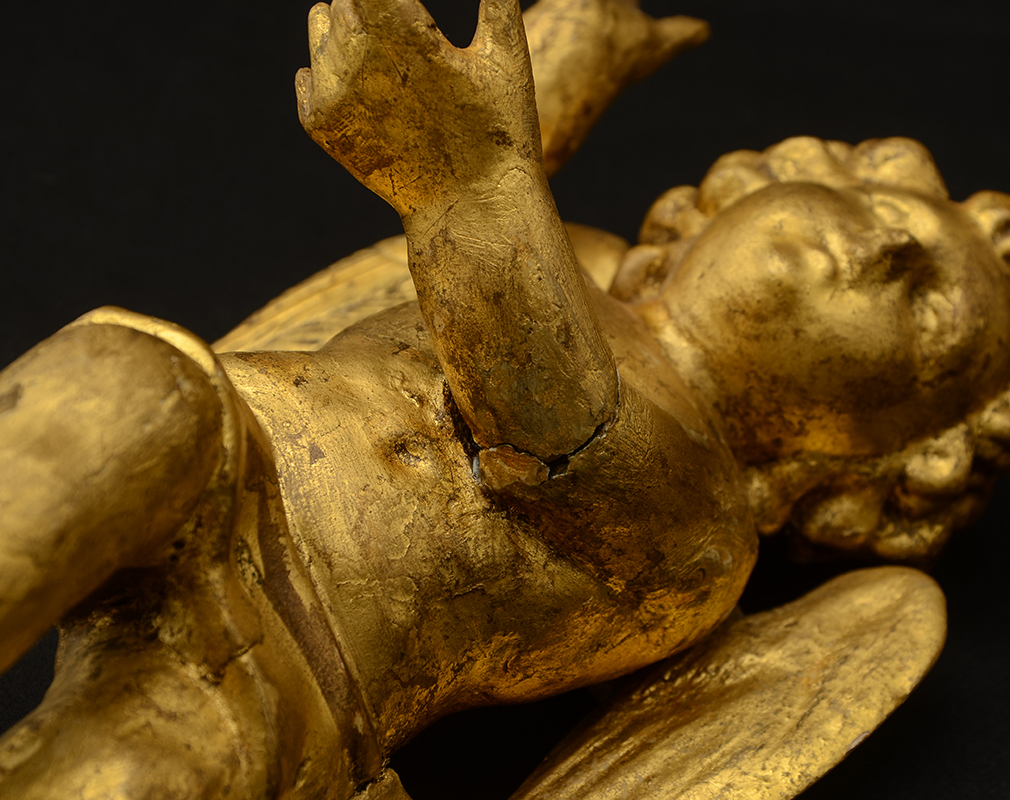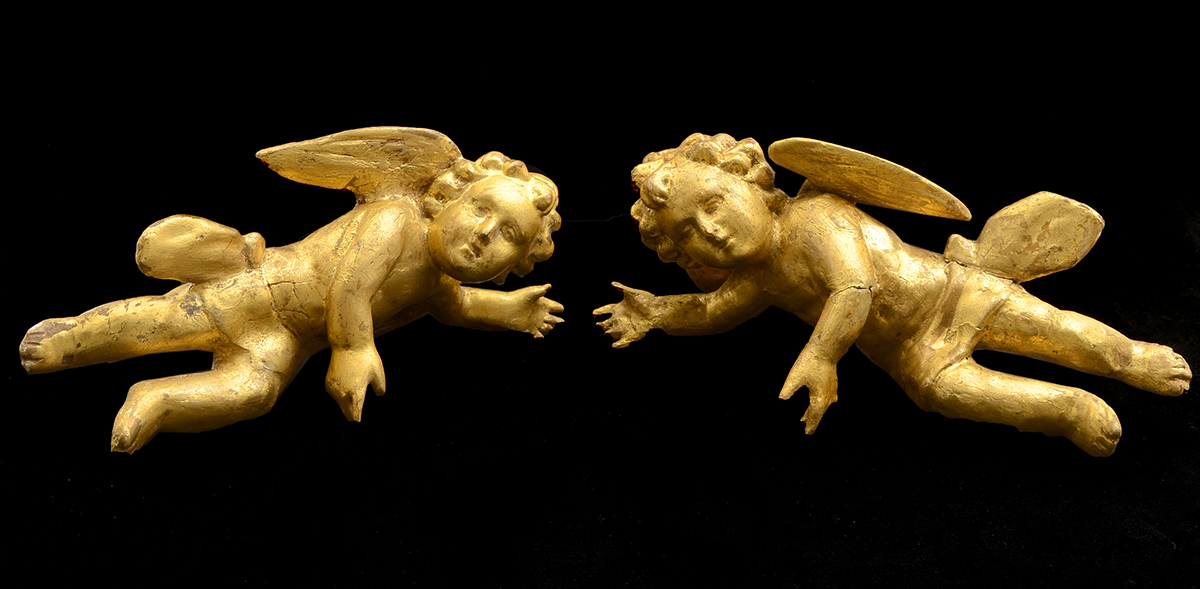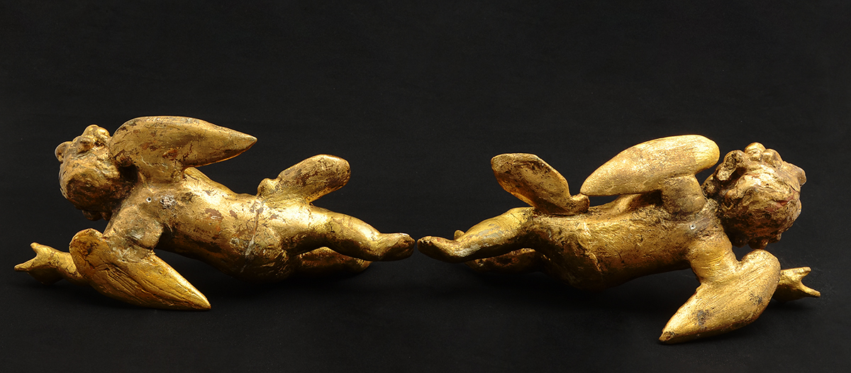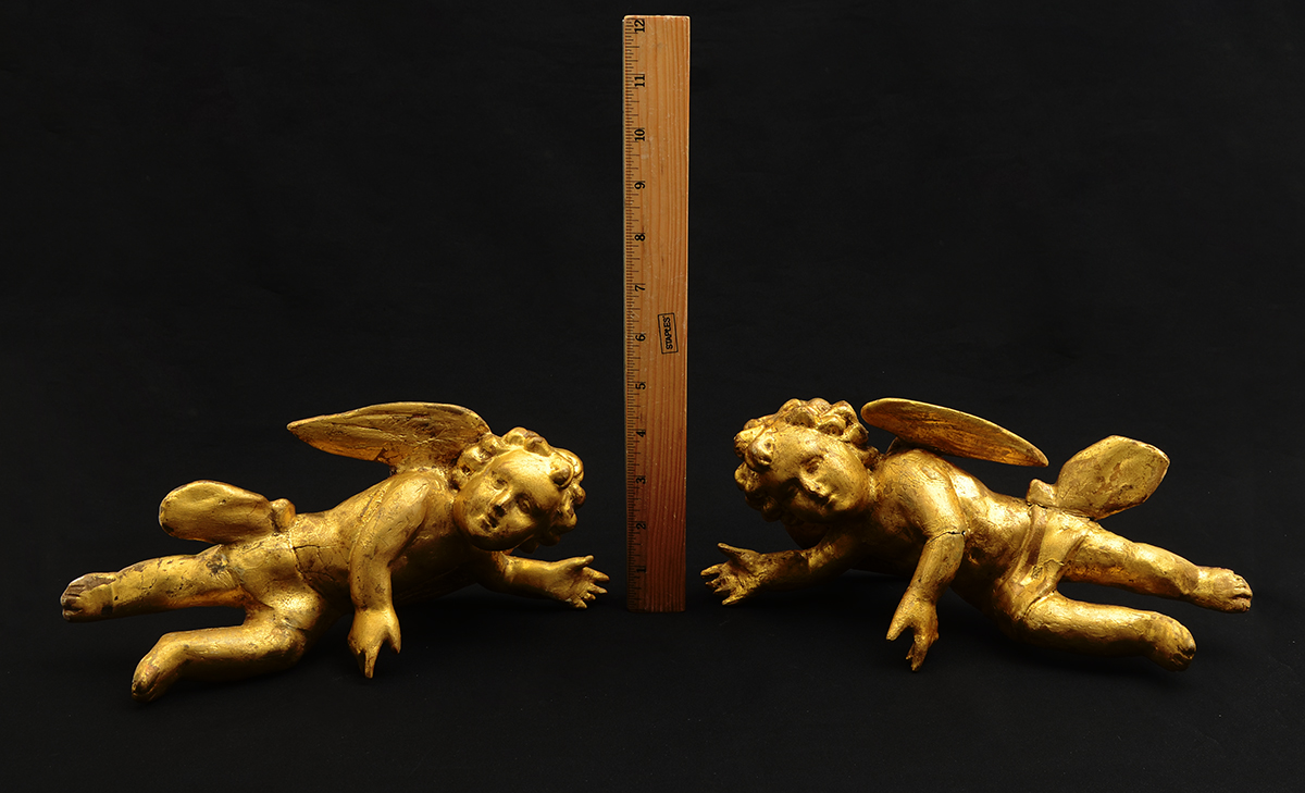 PAIR ANTIQUE CARVED GILT WOOD CHERUBS: 19th century mirror image matched pair, measure 11 1/4'' h. x 6'' x 4 3/4''.