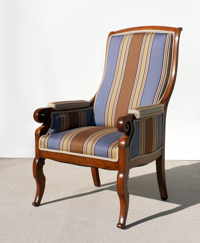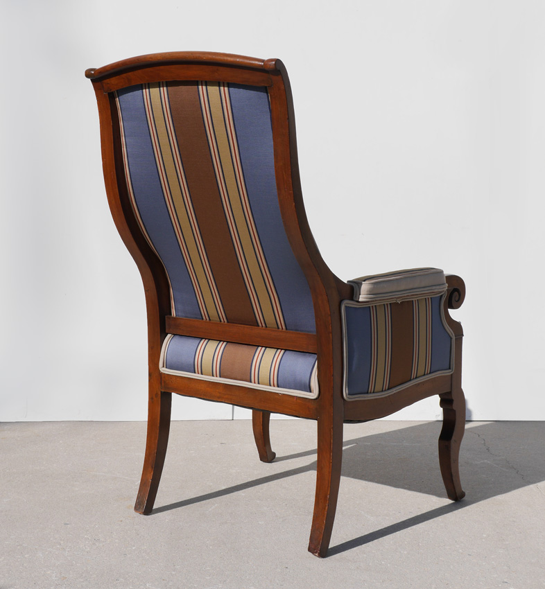 GENTLEMANS OVERSIZED MAHOGANY ARM CHAIR: Mahogany frame with shaped back, scroll hand holds, shaped front legs, vibrant striped upholstery. Overall measures approx. 47 1/2'' h. x 28 1/2'' x 33''.