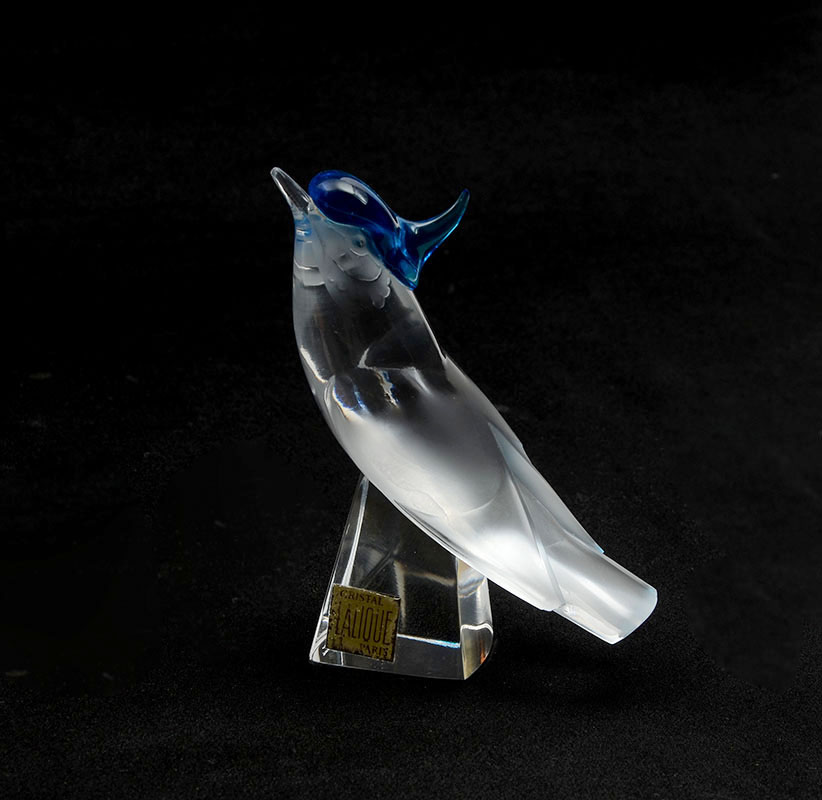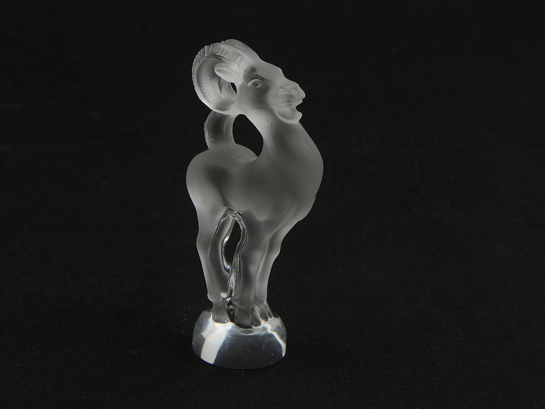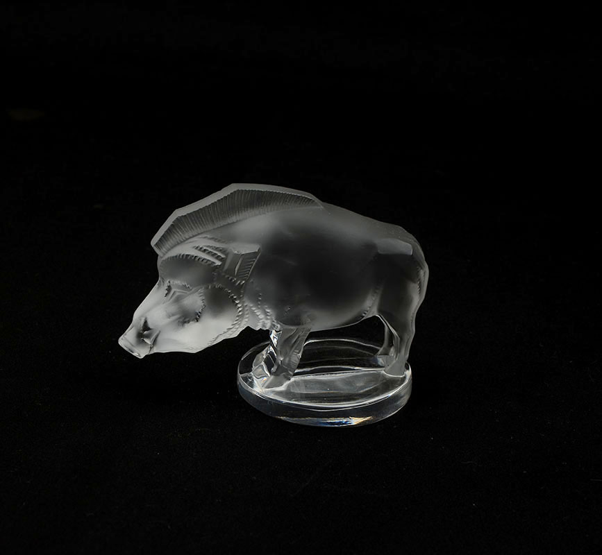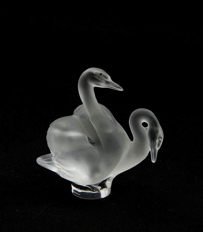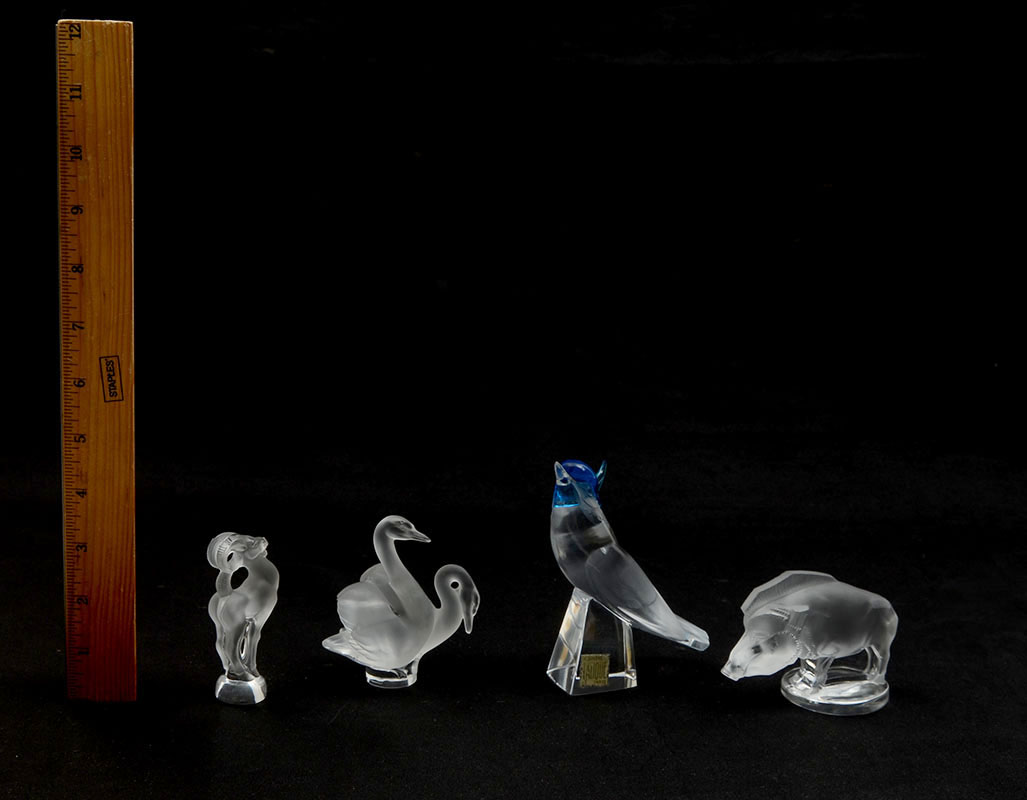 4 LALIQUE CRYSTAL PAPERWEIGHTS: 4 pieces total to include 1) Deux Cygnes frosted swans, 3 1/4'' h. 2) Boar, 3 1/2'' long. 3) Pimlico blue crested bird, 4 1/2'' h. 4) Bastia ram, 3 1/4'' h.