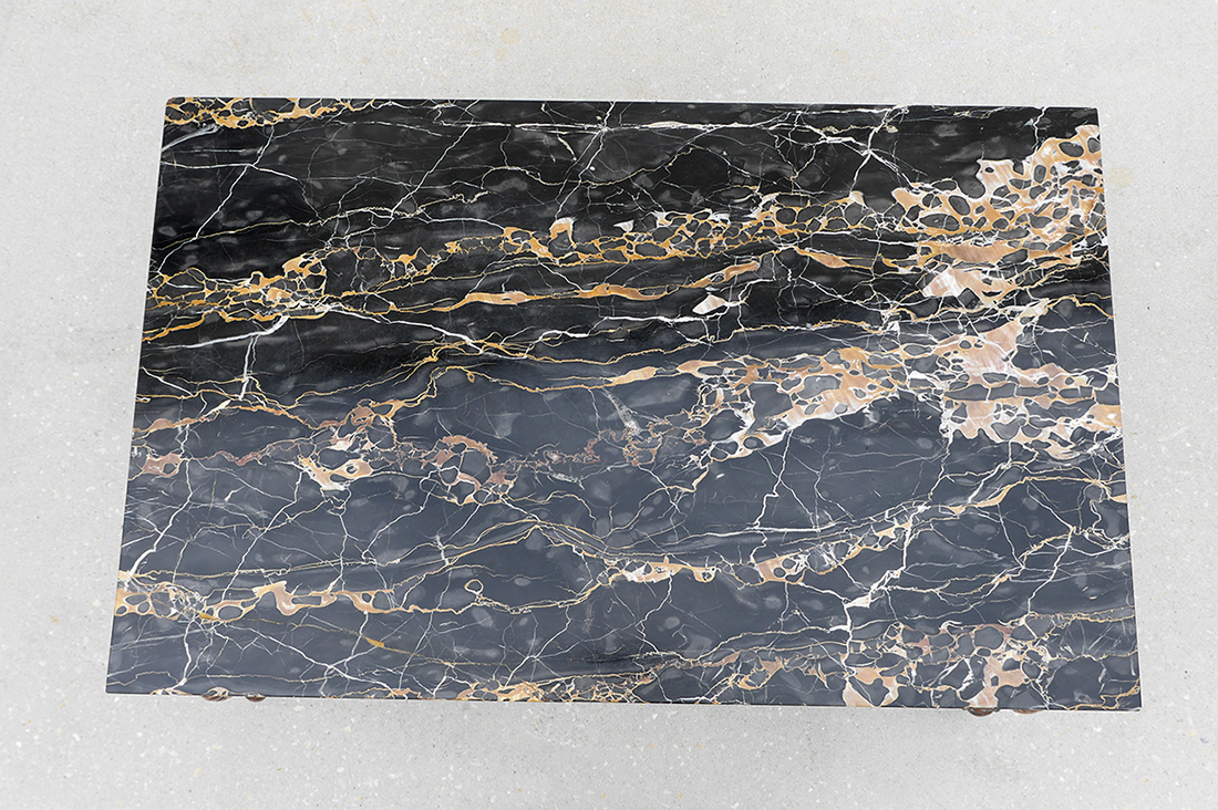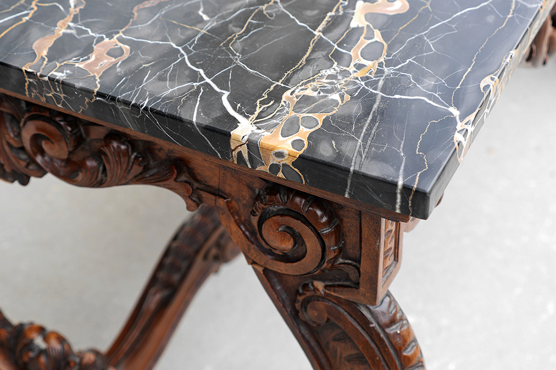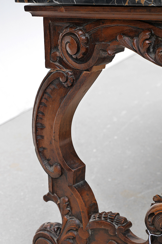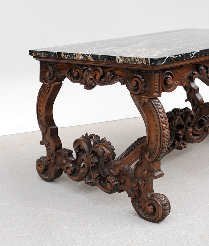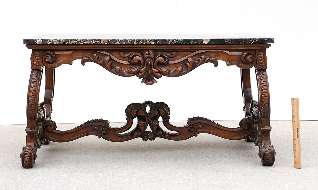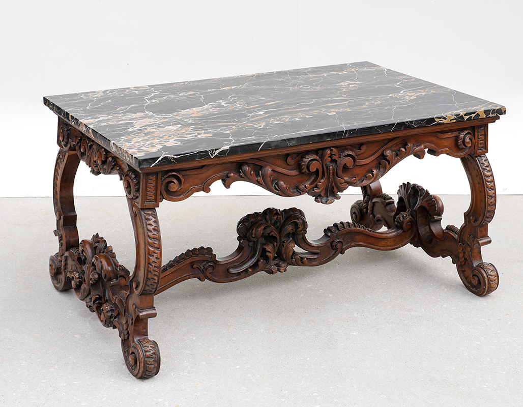 PROFUSELY CARVED MARBLE TOP COFFEE TABLE: Base carved all over in the rococo style with foliate scroll motifs. 21 1/2'' h. x 42'' x 26''. Sold with a restored marble top, 42 3/4'' x 26 3/4'' x 1''.