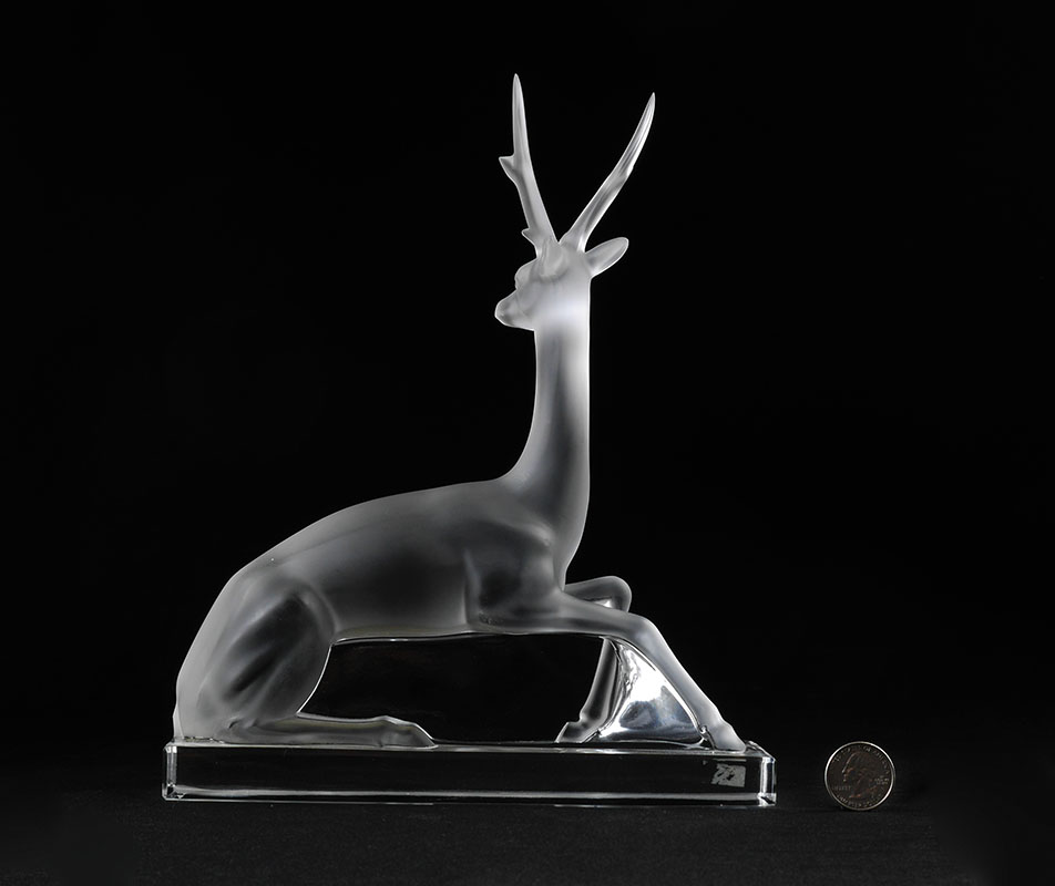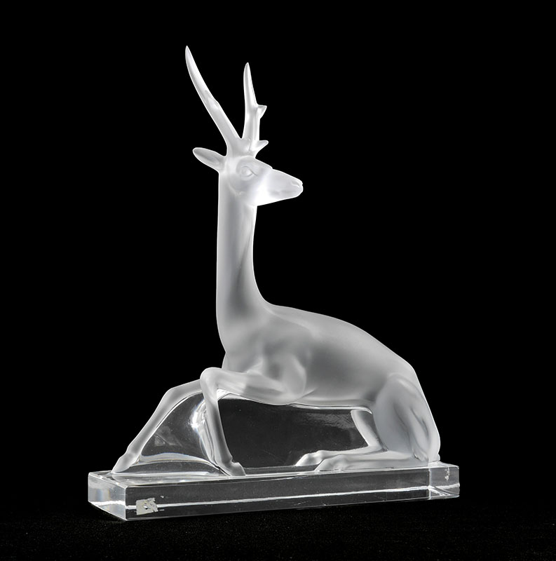 LALIQUE FROSTED AND CLEAR CRYSTAL STAG FIGURE: Figure of a recumbent stag deer, etched Lalique France, measures 10 1/4'' h. x 8 1/2'' x 2 1/2''.