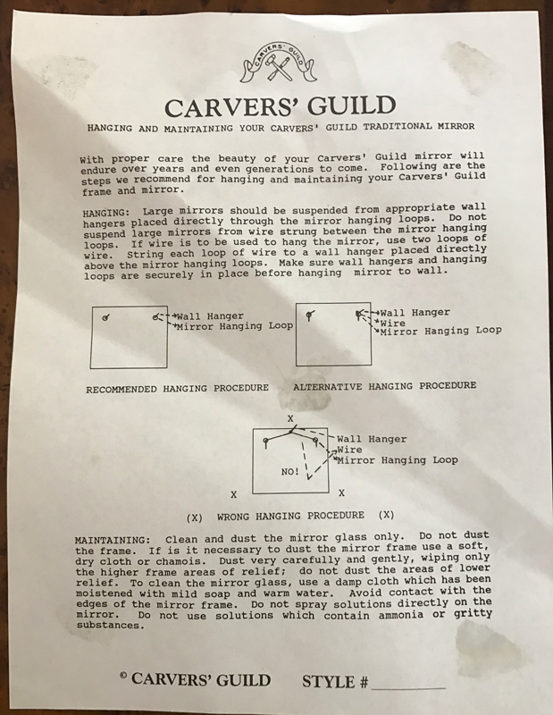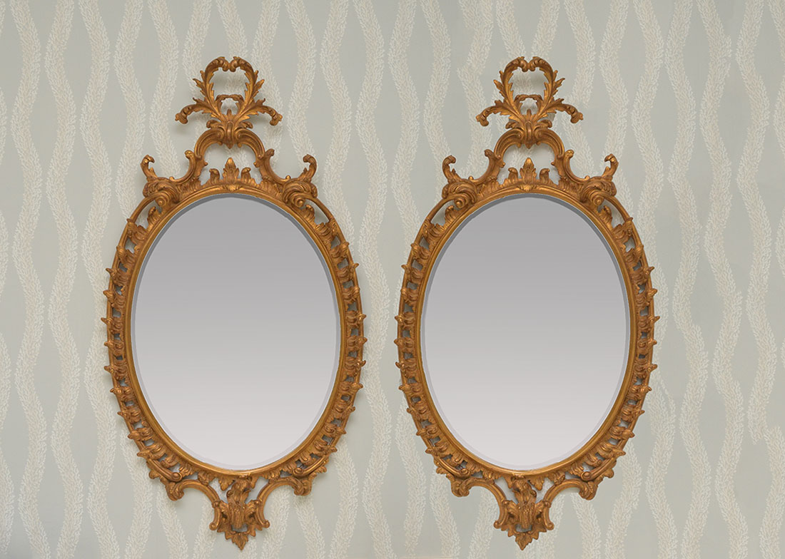 PAIR OF CARVERS GUILD ROCOCO STYLE MIRRORS: Contemporary carved gilt wood frames in the rococo style with openwork foliate motifs, oval beveled glass mirrors. Original Carves Guild instructions on back, overall measures 48'' h. x 26'' x 3''.