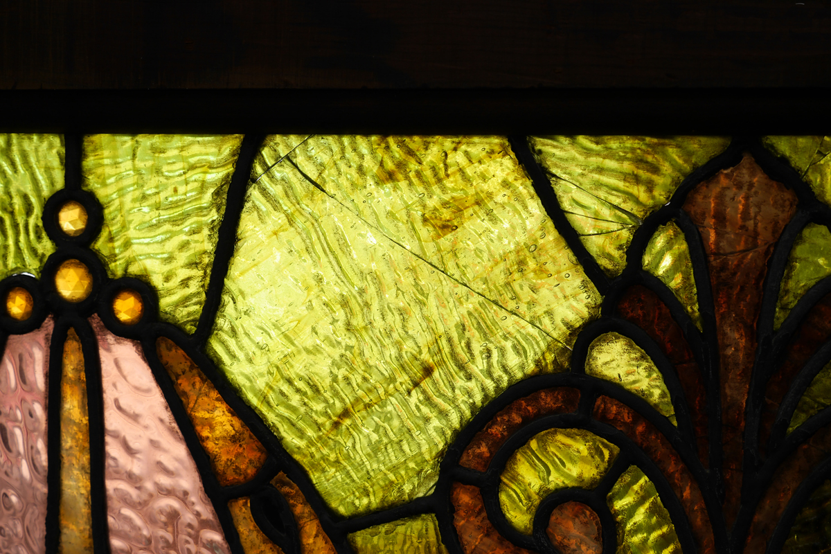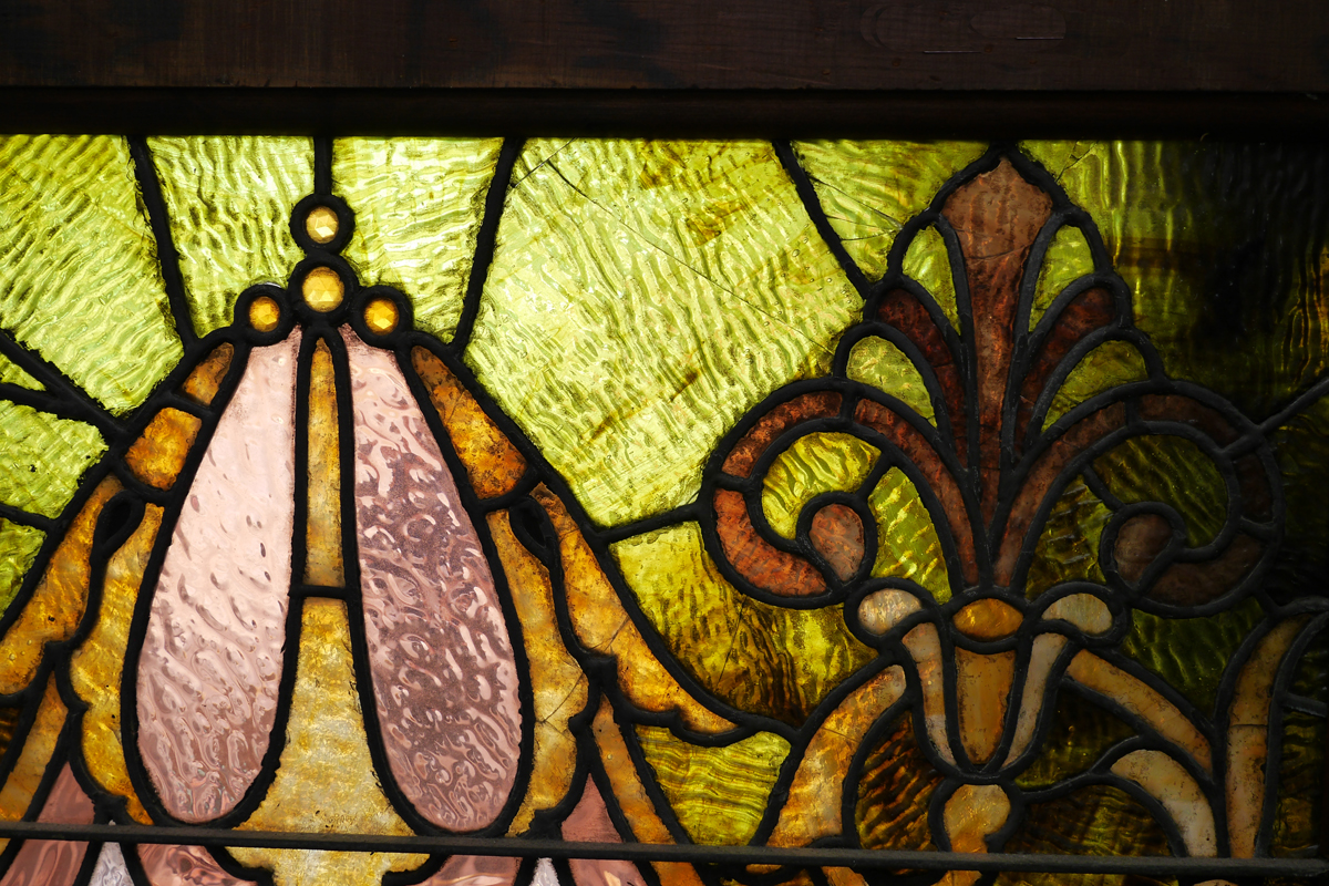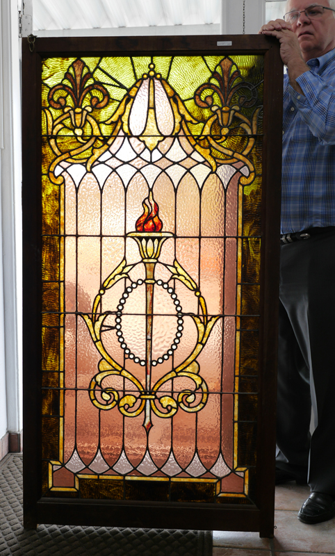 VINTAGE LARGE FRAMED LEADED GLASS WINDOW: Window design with stylized floral motif top, center torch and wreath, assorted styles of glass. Window measures 55 1/2'' h. x 27 1/4'', wood frame measures 61 1/4'' h. x 32''.