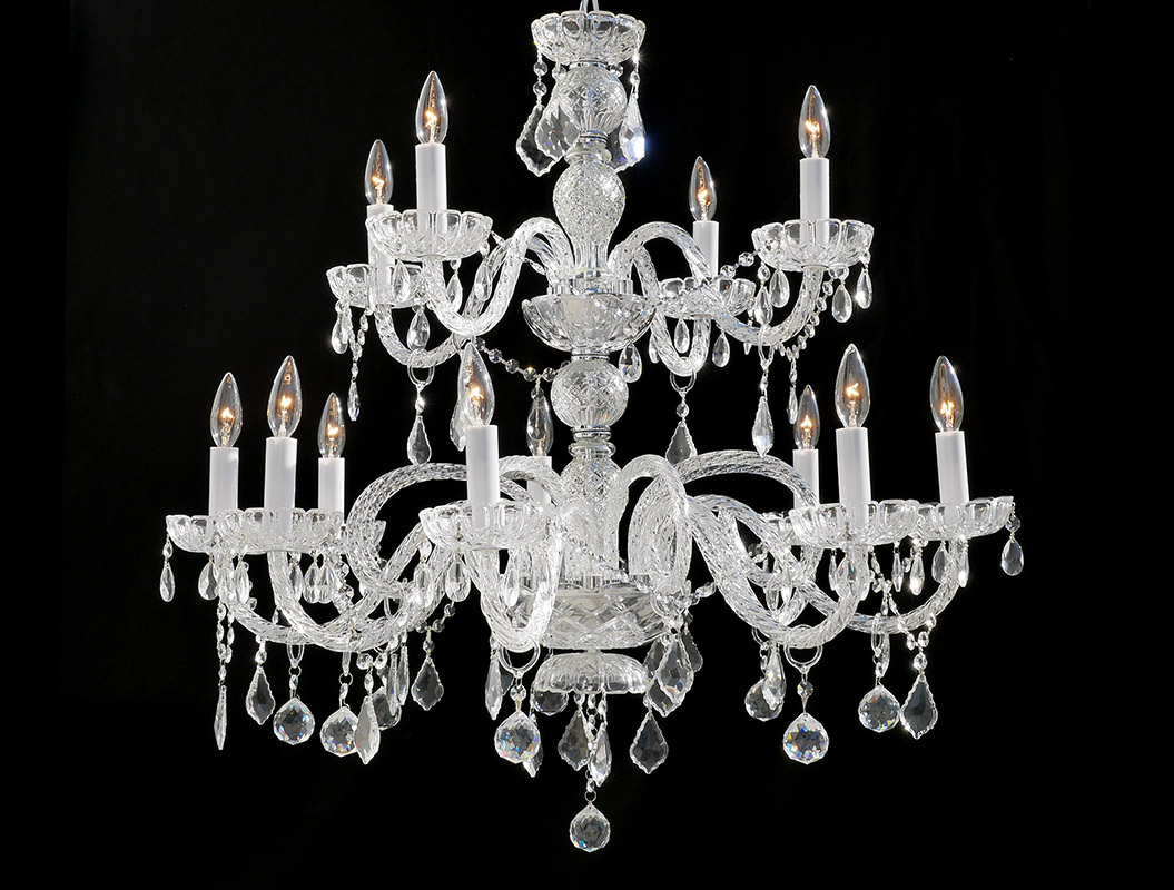 2 TIER 12 LIGHT CRYSTAL CHANDELIER: Contemporary 12 light chandelier with crystal prisms, swags and drops. Overall measures approx. 28'' h. x 33'' dia.