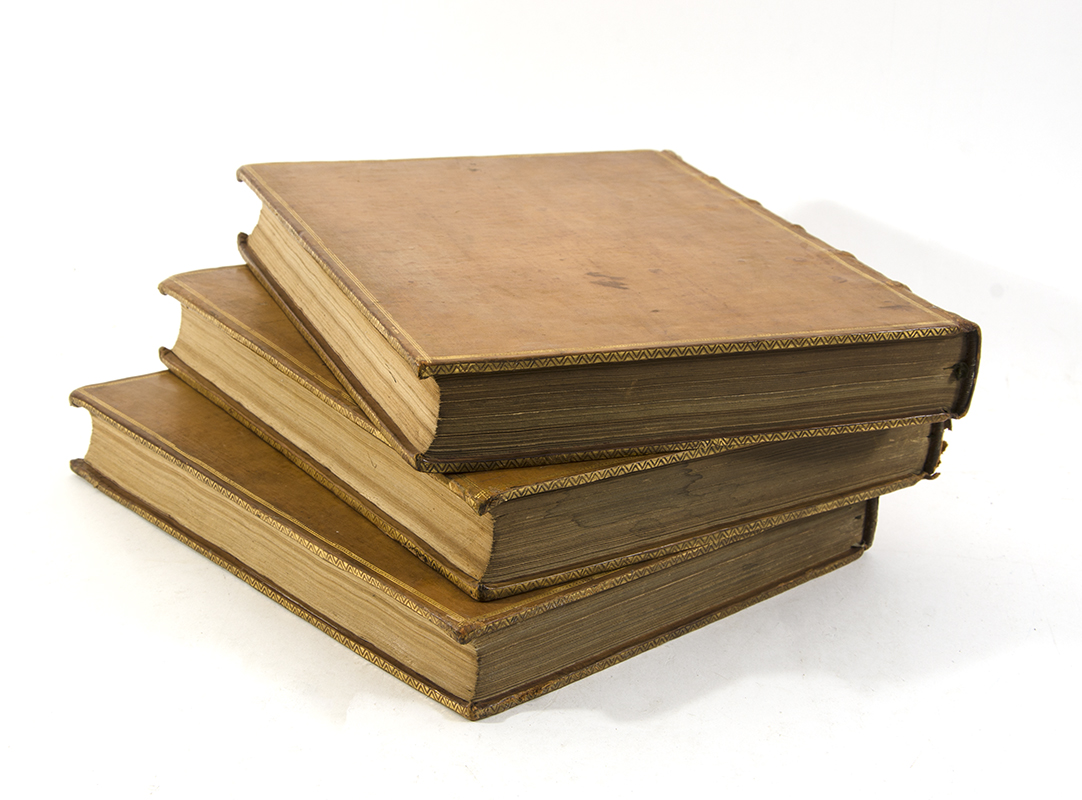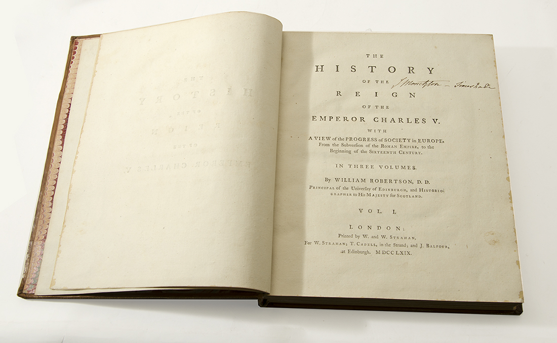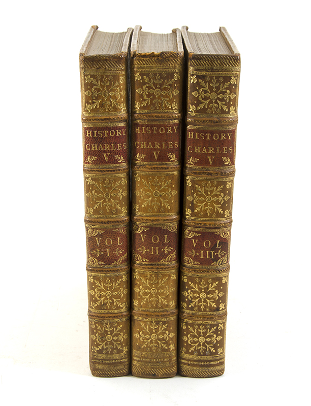 3 VOLUMES 1769 WILLIAM ROBERTSON HISTORY OF CHARLES V: Partial title ''The History of the Reign of Charles V,..., in Three Volumes'', by William Robertson, D. D., printed 1769 by W. and W. Strahan for W. Strahan; T. Cadell, in the Strand; and J. Balfour, at Edinburgh. Full leather covers with embossed trim, embossed spine. Overall each volume 1 3/4'' x 9'' x 10 1/2''.