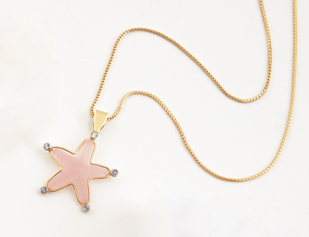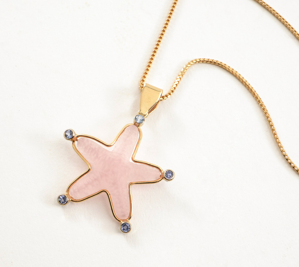 14K PENDANT FROSTED ROSE QUARTZ STARFISH WITH TANZANITE: Lovely hand-carved rose quartz starfish is set in 14K yellow gold frame with bezel set tanzanites at each point of the starfish. 14K wheat link necklace is 20'' long and weighs 6.5 grams. 1.5'' in diameter.