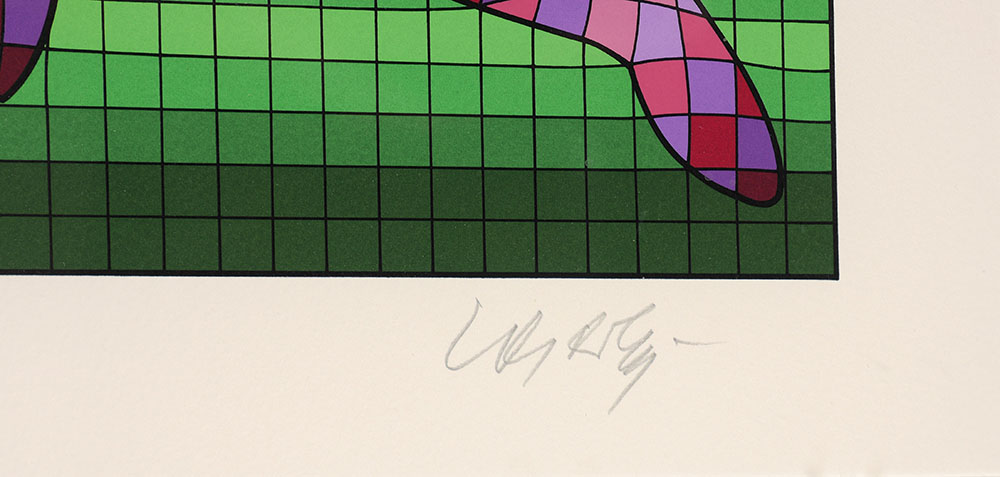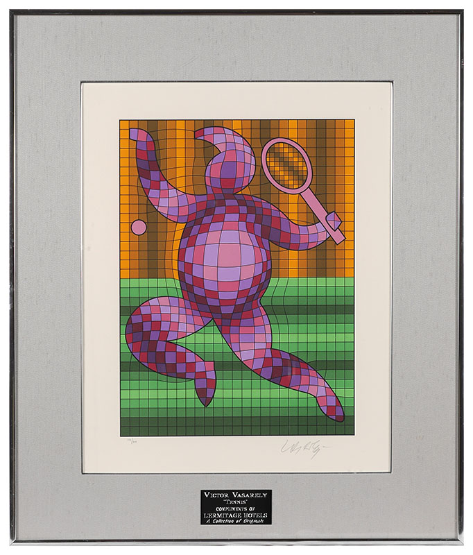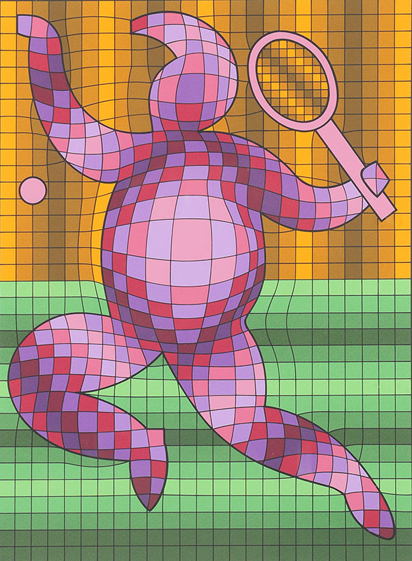 VASARELY, Victor (French, 1906-1997): Tennis Player Serigraph, sight size 16.5'' X 12.75'', pencil signed lower right, numbered 103/300 lower left, metal frame, 22.75'' x 19.25''. Victor Vasarely used many innovations in optical illusions as well as color that had a profound influence on contemporary art.