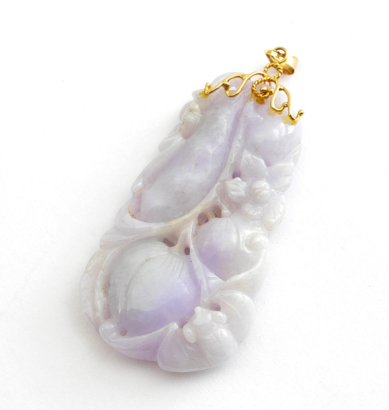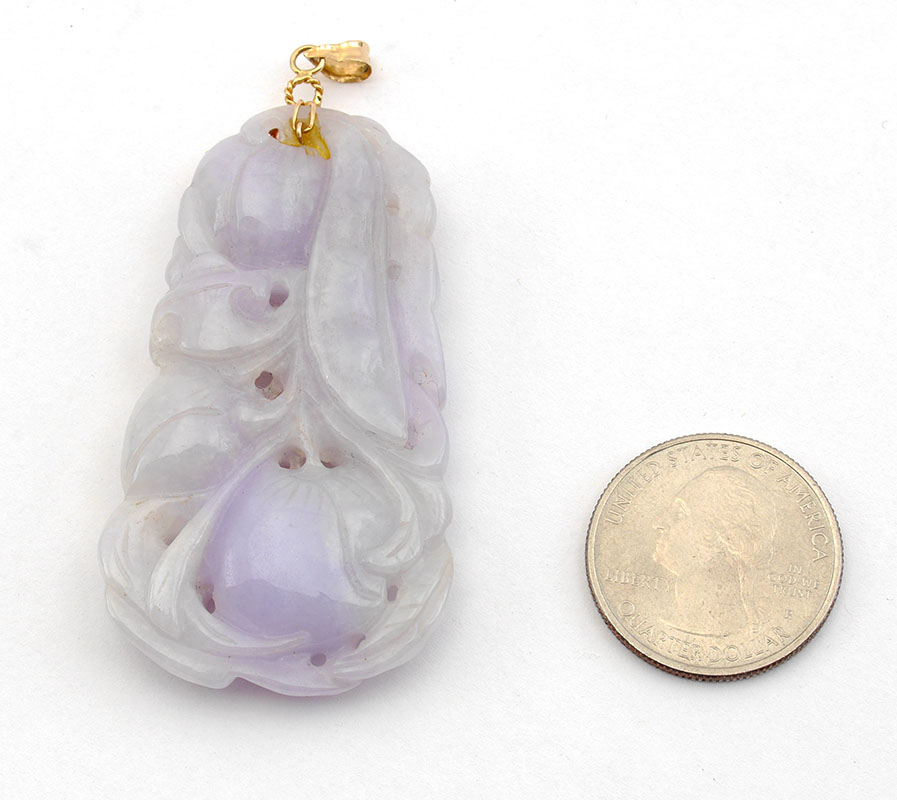 FRUIT & FLOWER MOTIF LAVENDER/GREEN JADE PENDANT: 2 sided lavender and green jadeite or similar stone pendant featuring pierced fruit and flower motifs. Semi translucent with a glossy shine. 14K gold bail and marked. Measures 2.25'' long x 1.25'' at the widest point. Total weight 27.5 grams.