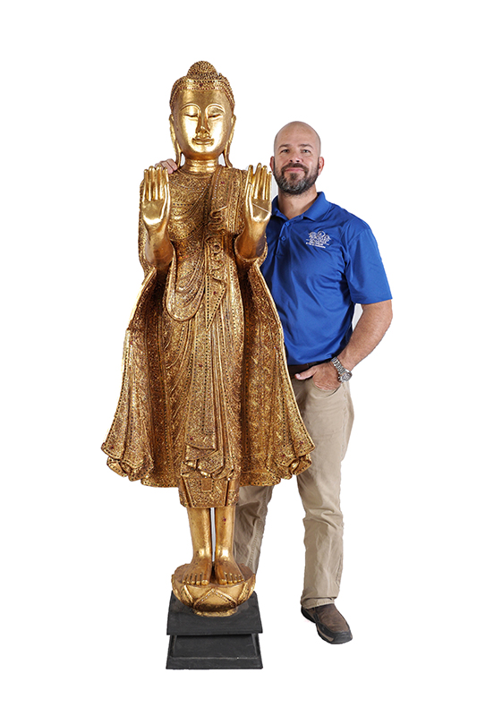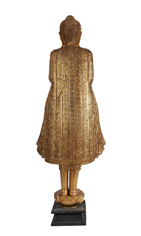 LIFE SIZE CARVED GILT WOOD BURMESE STANDING BUDDHA: Carved gilt wood with mirrored glass inset accents, raised palms, closed eyes, flowing robe. Affixed to ebonized stand, overall 74 1/2'' h. x 27'' x 16''.