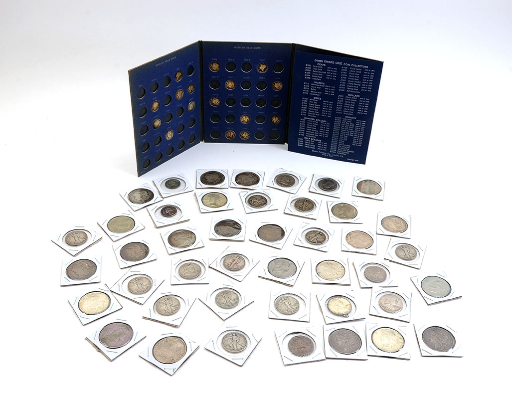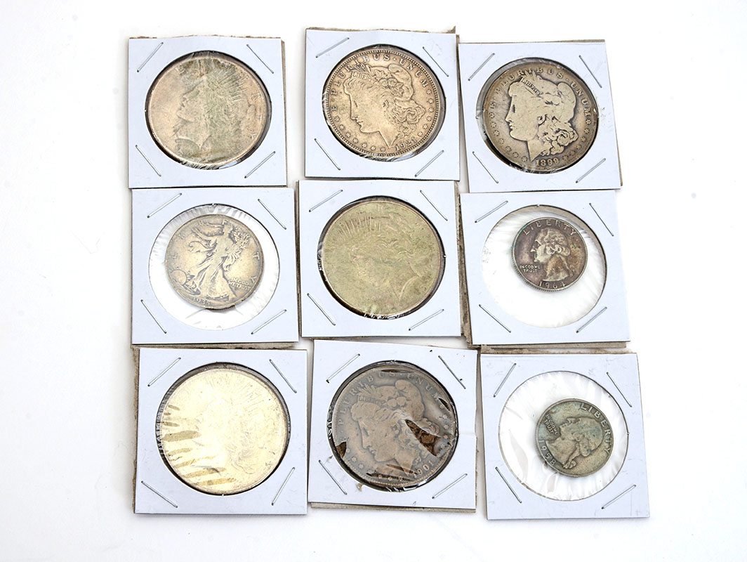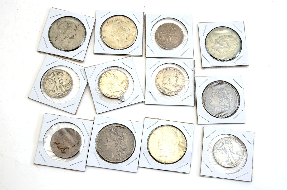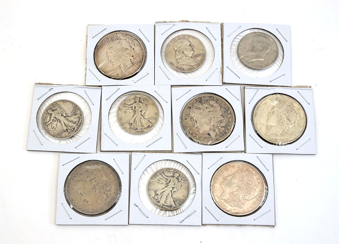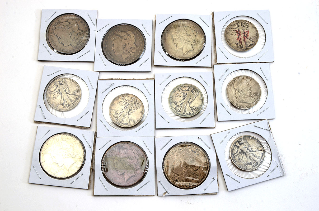 COLLECTION OF US SILVER DOLLARS & MORE: An assembled collection of US silver coins to include 11 Morgan dollars, 10 Peace dollars, 16 half dollars including 1925 Stone Mountain, 2 quarters, 2 clad silver dollars. Ungraded.
