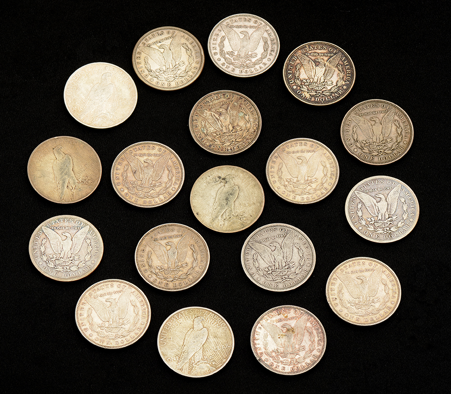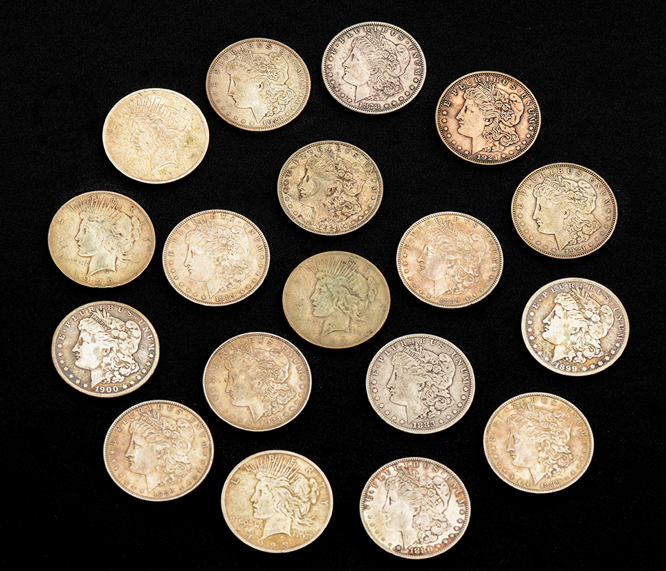 COLLECTION OF 18 US SILVER DOLLARS: 18 US dollars total, 14 Morgan dollars to include 1878-S, 1880-O, 1883, four 1889, 1899-O, 1900-O, four 1921, 1921-S. 4 peace dollars to include three 1922, 1923. Ungraded.