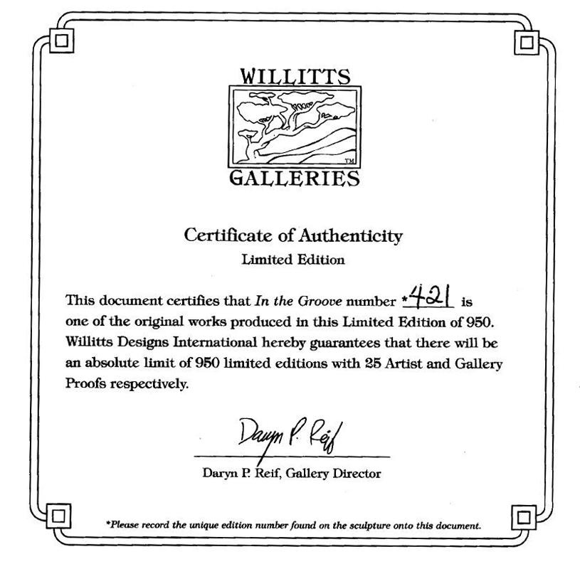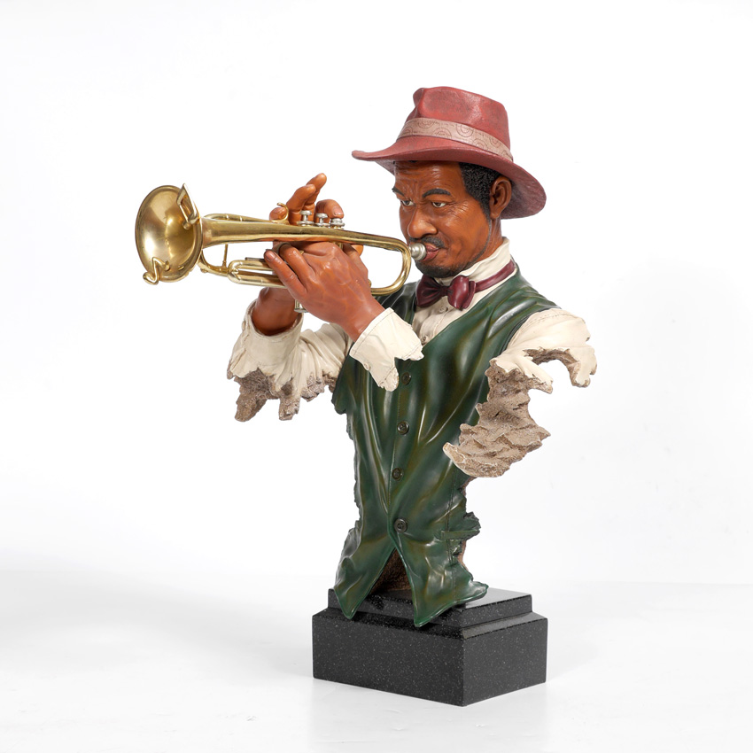 WILLITTS DESIGNS IN THE GROOVE JAZZ SCULPTURE: Composite resin figure of a trumpet player from the ''All That Jazz'' collection by Willitts Designs. Limited edition number 395/950 with COA. Measures 21 3/4'' h. x 13 1/2'' x 19''. Currently offered at artodc.com at $2000.00.