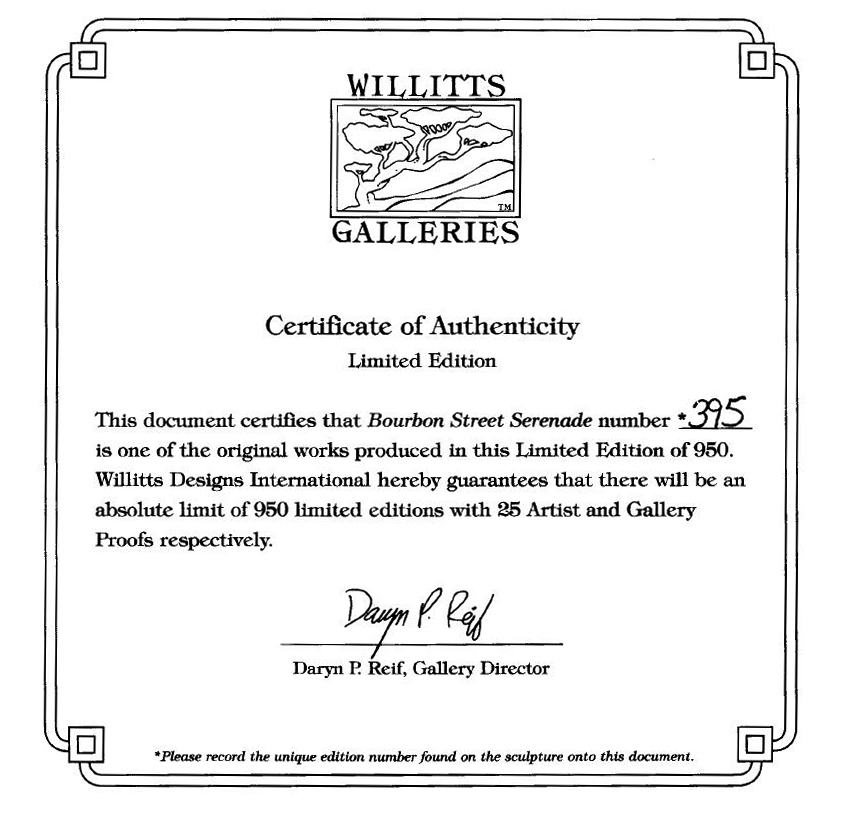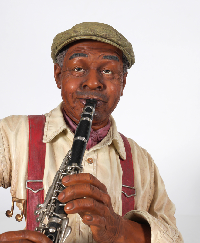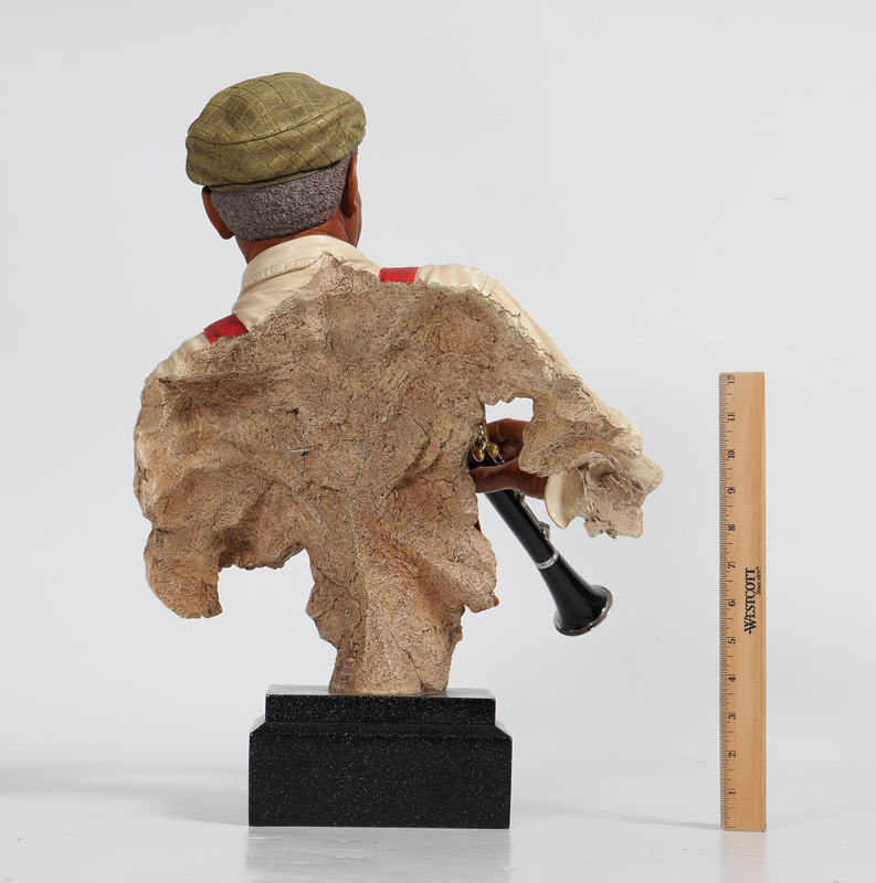 WILLITTS DESIGNS ALL THAT JAZZ CLARINET SCULPTURE: Entitled ''Bourbon Street Serenade'', composite resin figure of a clarinet player from the ''All That Jazz'' collection by Willitts Designs. Limited edition number 421/950 with COA. Measures 20'' h. x 14'' x 14 3/4''. Available on line at artodc.com for $2,200.00.