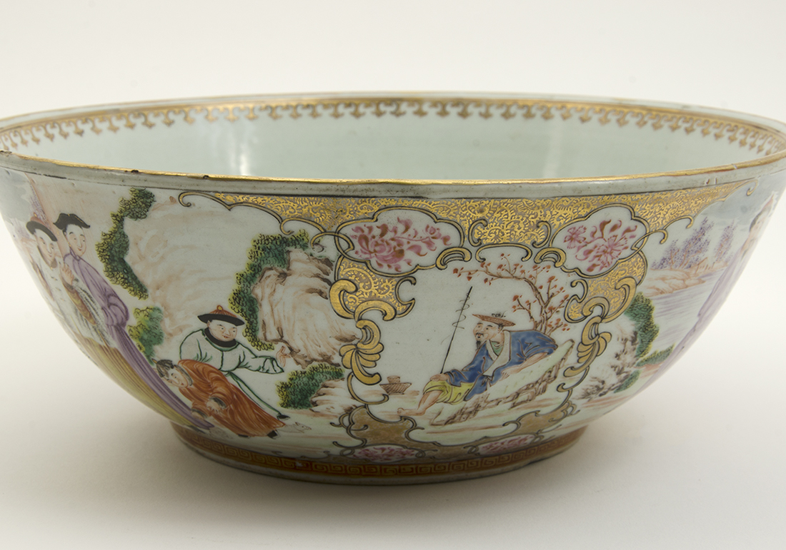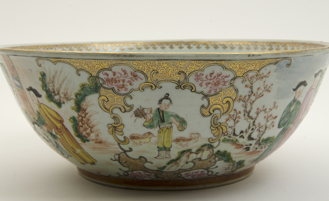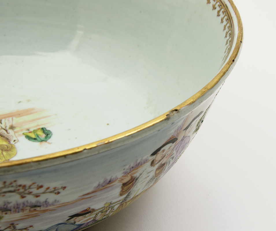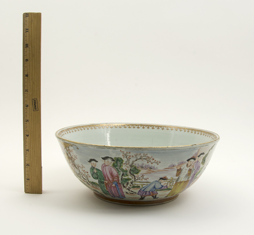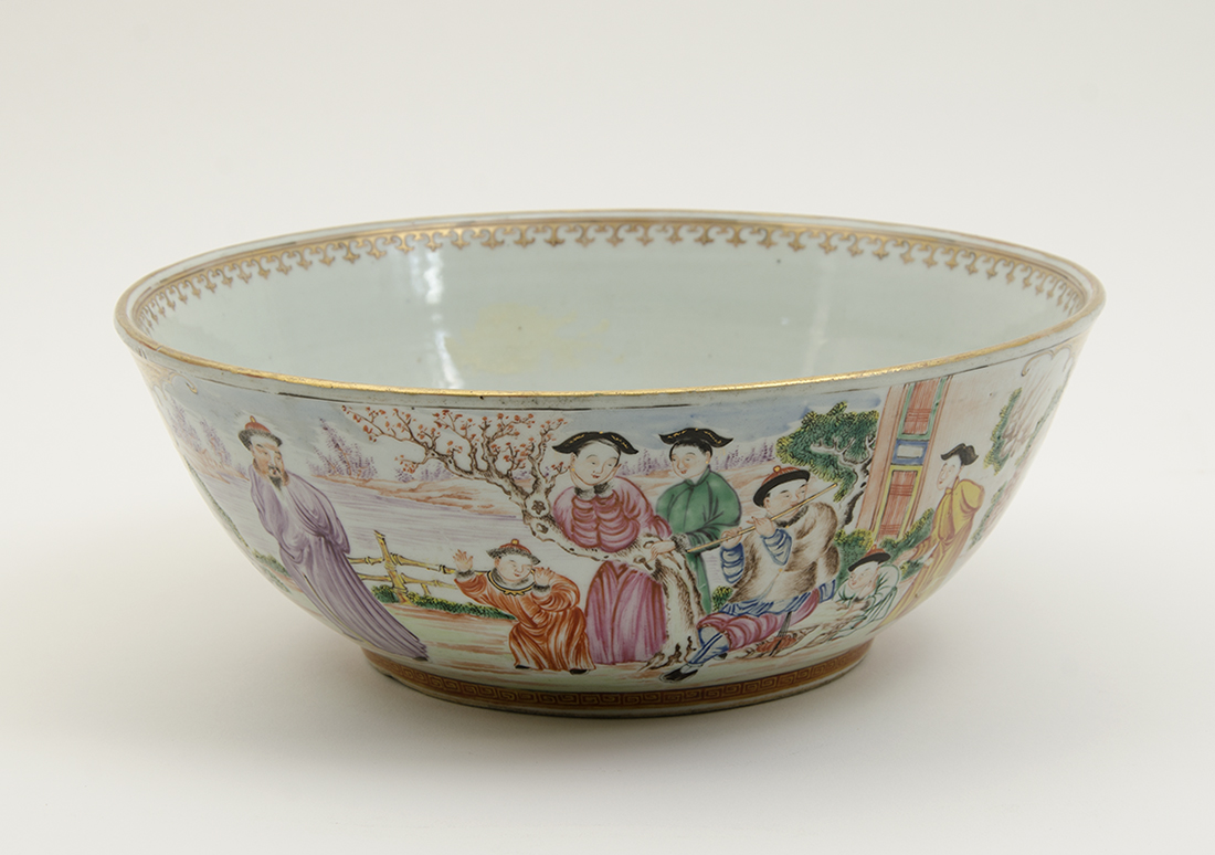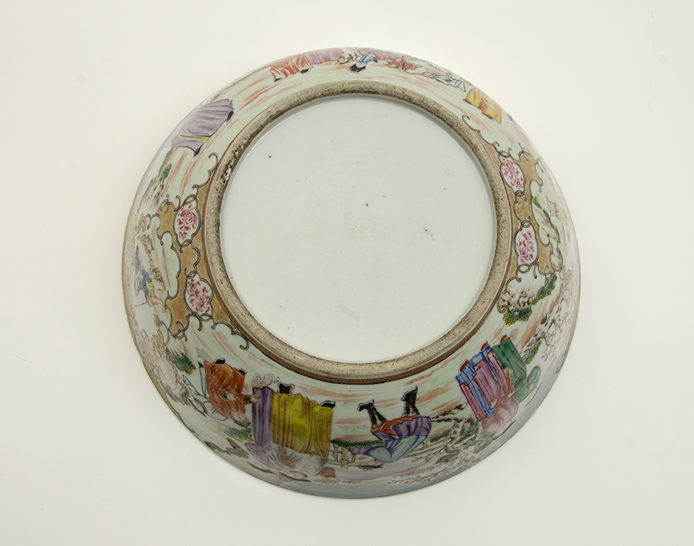 CHINESE ROSE MANDARIN BOWL: Exterior with outdoor genre scenes in reserves, interior base with maiden and child with tree. No visible signature or markings, 4 1/4'' h. x 11 1/4''.