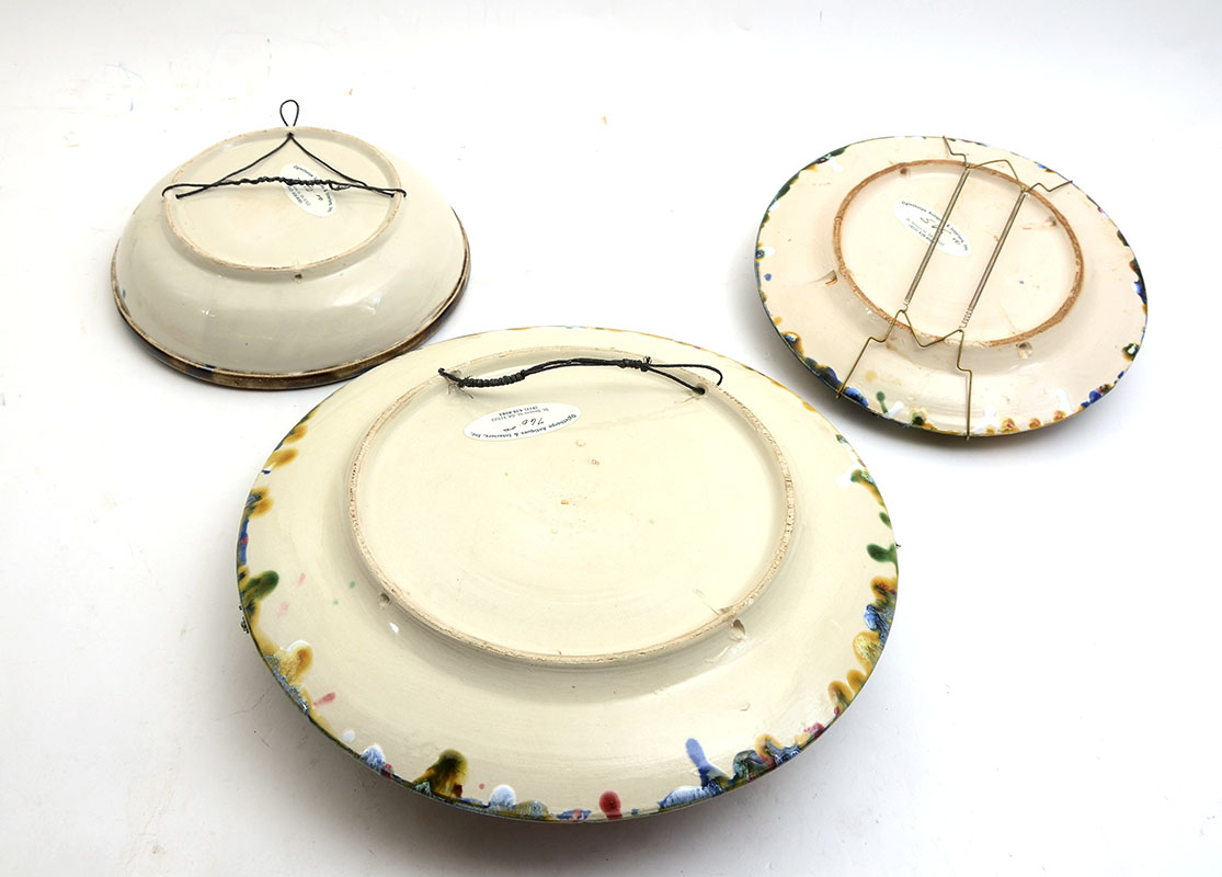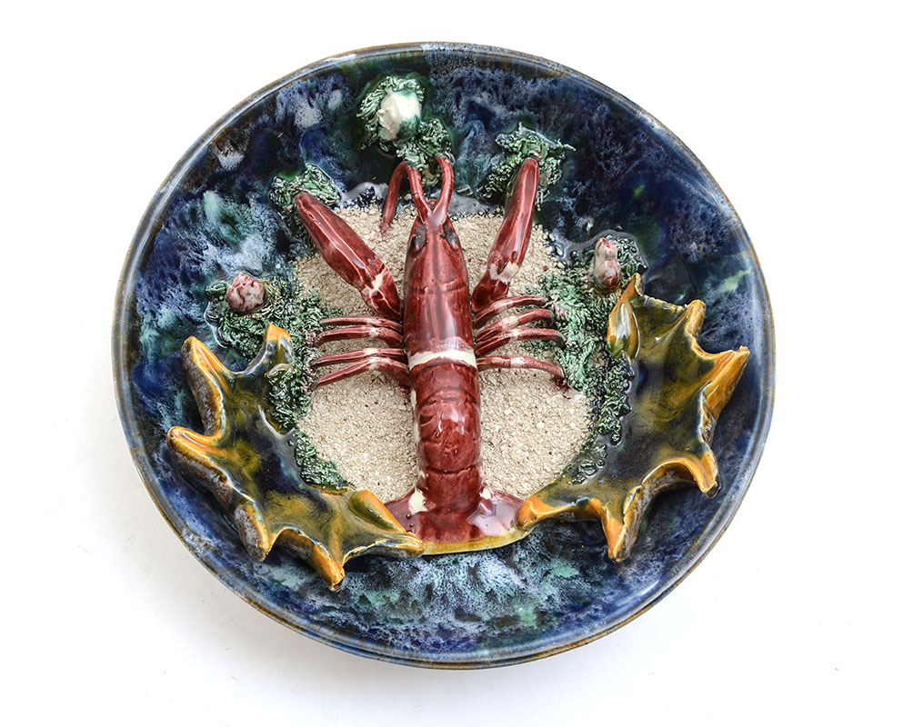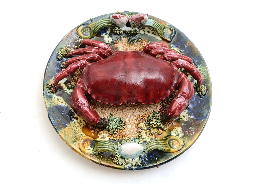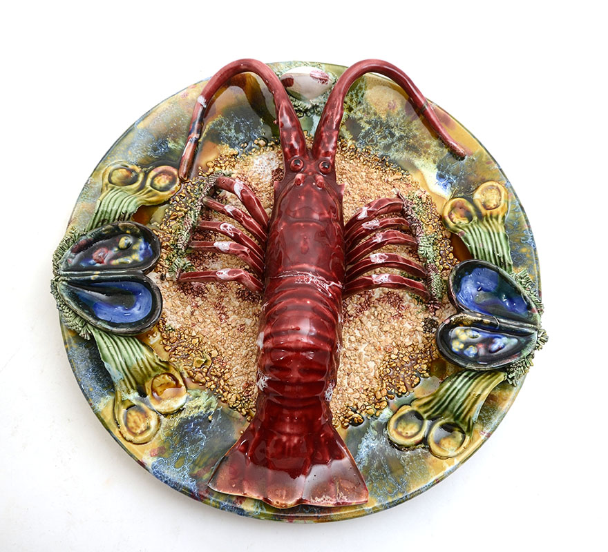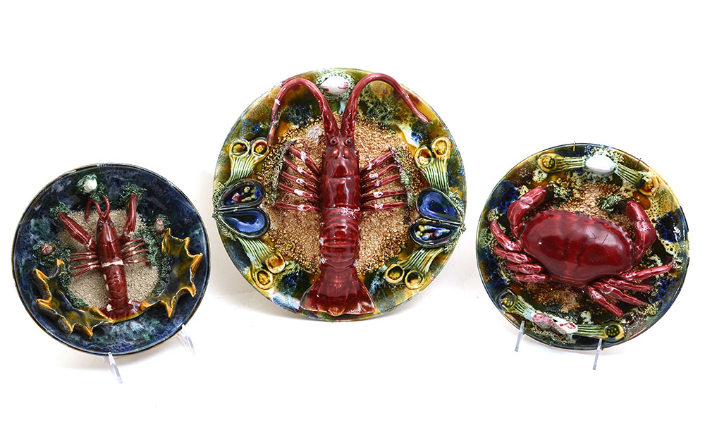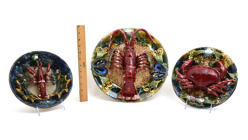 3 PALLISY WARE SEA LIFE PLATES & BOWL: 3 pieces total, all unmarked to include 1) Larger plate with lobster and mussels, 3 1/2'' x 13''. 2) Bowl with smaller lobster and mussels, 2 1/2'' h. x 9 1/4''. 3) Plate with crab and mussels, 3'' h. x 10'' dia.
