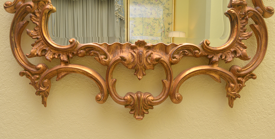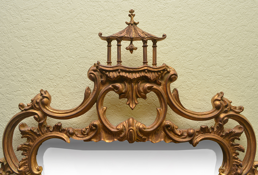 CHINESE CHIPPENDALE STYLE GILT WOOD MIRROR: Contemporary carved gilt wood frame with pagoda crest, reticulated foliate scroll and garland, overall measures 50'' h. x 29 1/2'' x 2 1/2''.