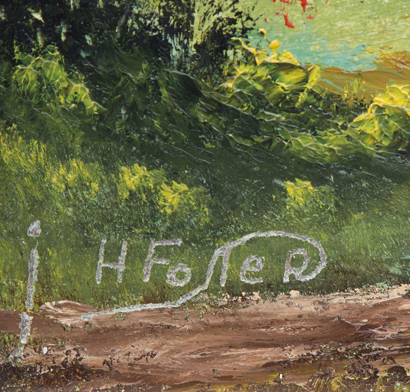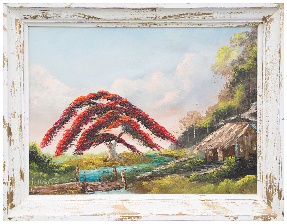 FOSTER, Horace, (American, 20th Century): Highwaymen style Royal Poinciana and house at waters edge, Oil/Masonite, 18'' x 24'', framed 21 1/2'' x 27 1/2''.