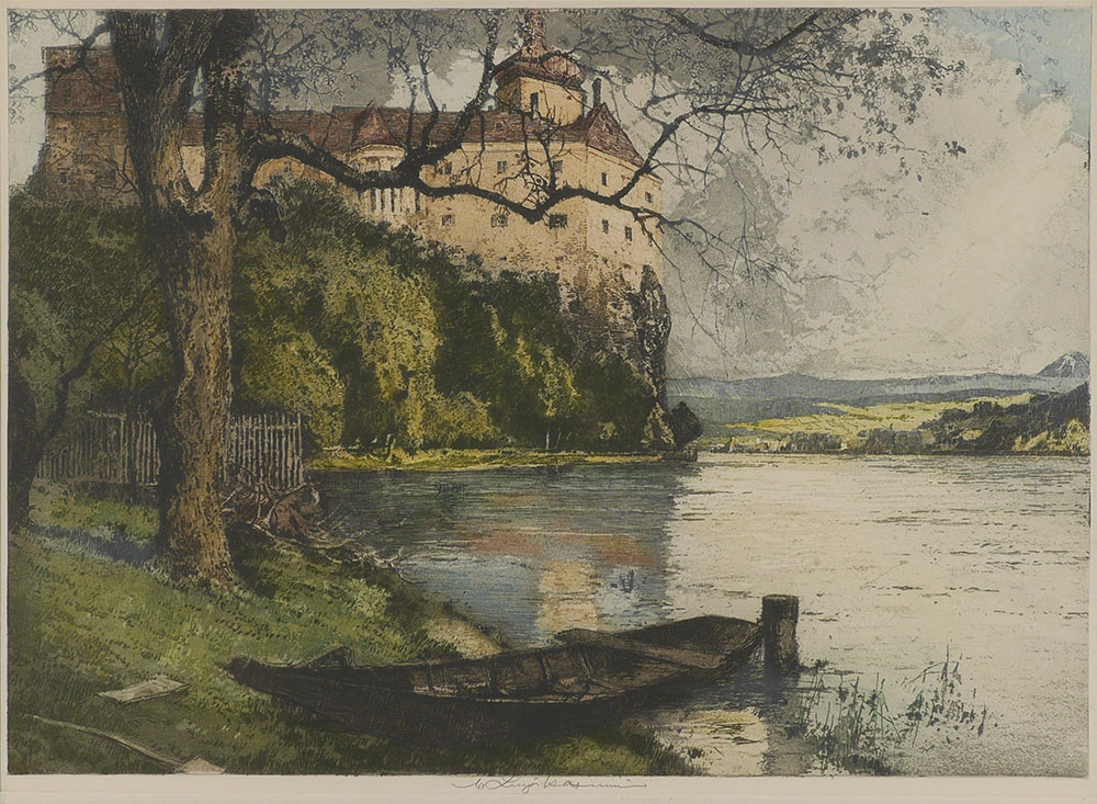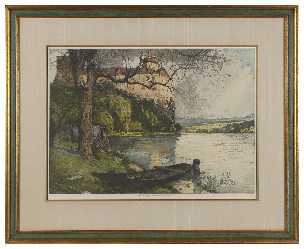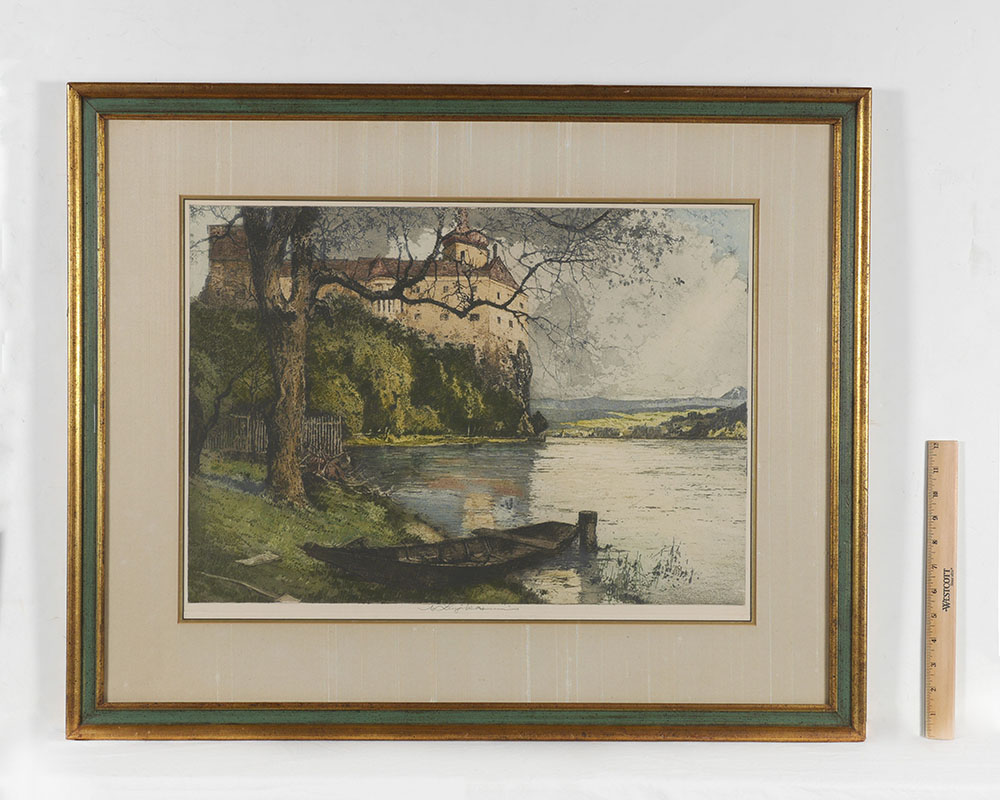 KASIMIR, Luigi (Austrian, 1881-1962): ''Persenberg Castle'', Color Etching in Aquatint, sight size 16.75'' X 23'', estate signature in lower mid margin, framed, 26.5'' x 32.5''. Luigi Kasimir's etchings in black and white have been popular for over 40 years.