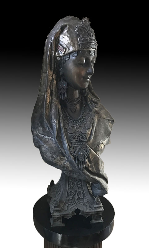 FRENCH 19TH CENTURY ORIENTALIST FEMALE SPELTER BUST: Cold painted, heavy spelter, one half of the famous ''Couple D' Ottomans''. Attributed to Louis Hottot (1829-1905), measures 28 1/2'' h. x 13'' x 9''. Sold with contemporary fluted wooden pedestal, 35 1/2'' h. x 12''.