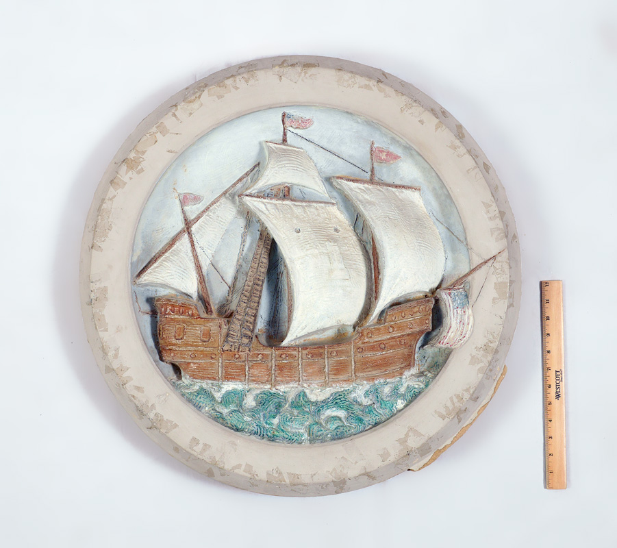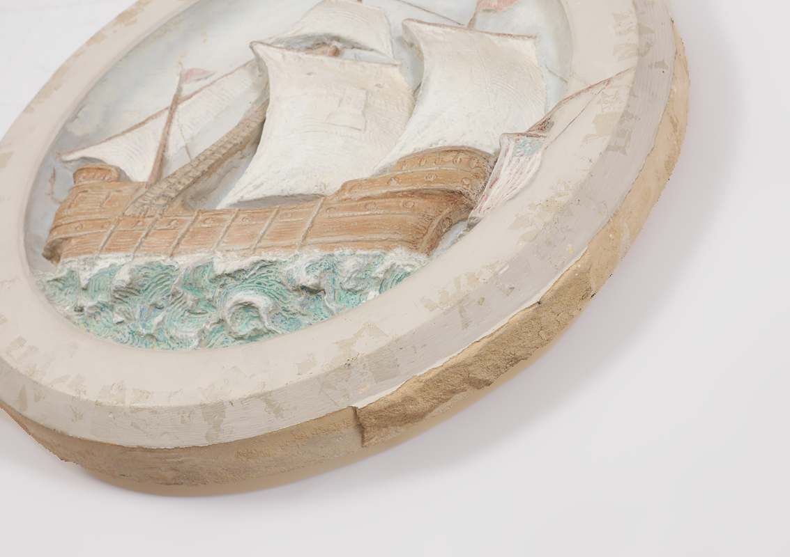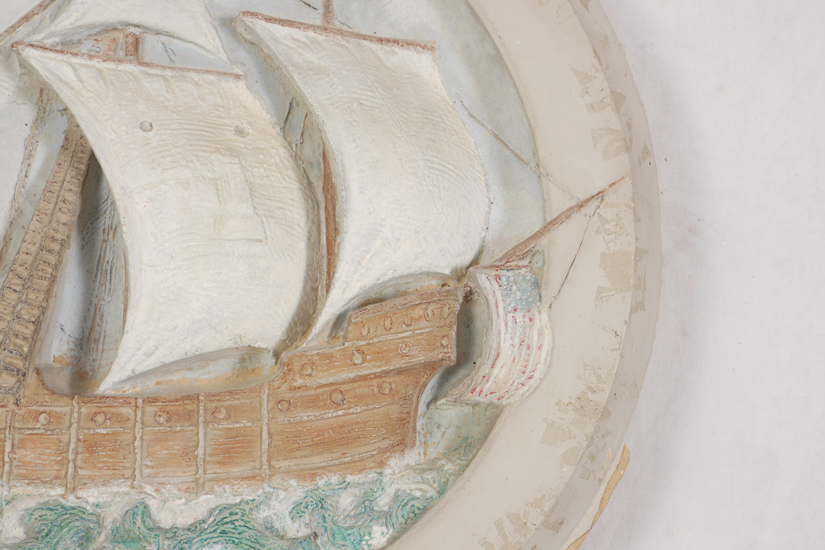 MARITIME MOTIF HEAVY CEMENT RELIEF PLAQUE: 24.5'' D, depicting early American sailing lesson, 3'' thick, no visible signature, in style of Bachelder.