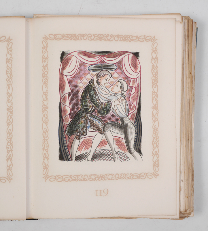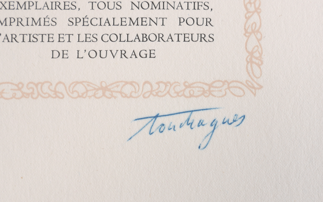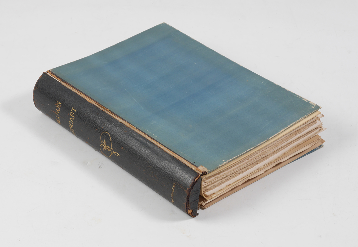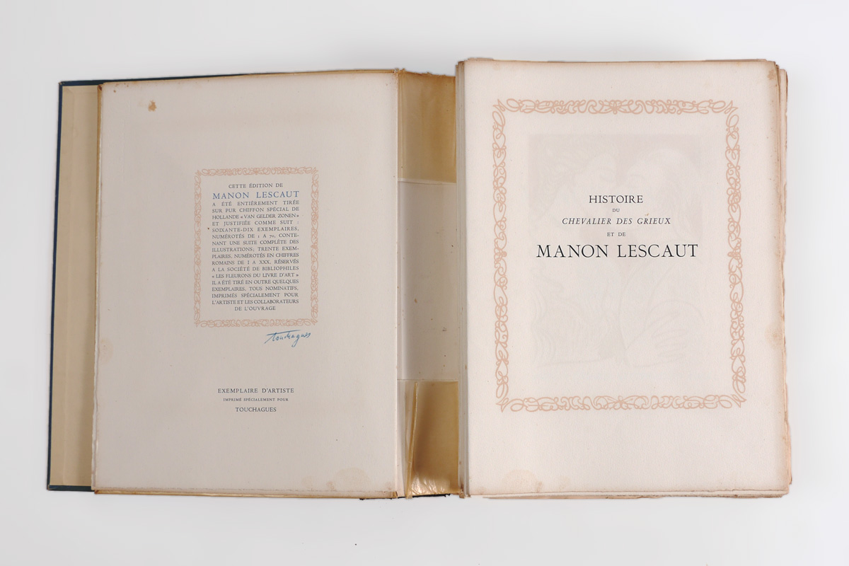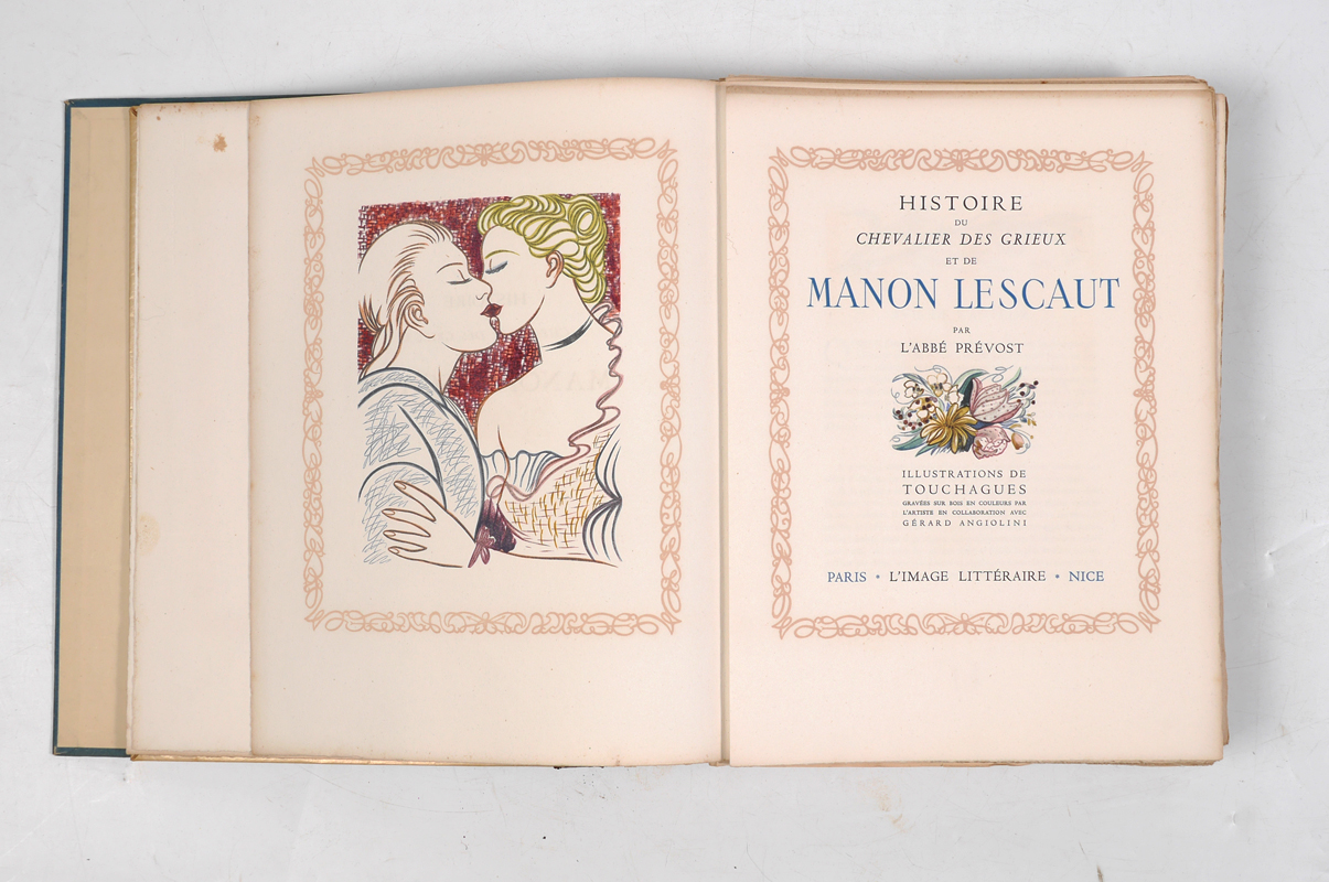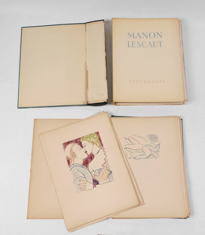 TOUCHAGUES, Louis, (French, 1893-1974): ''Historie du Chevalier Des Grieux et de Manon Lescaut'', by L'Abbe Prevost, illustrated by Touchagues, limited to 100 copies, published 1949 by L'Image Litteraire, Paris / Nice. 2 volumes in one, first volume with text an illustrations, the second volume with reproduction of the original illustrations only. Loose bound with blue cloth hard covers, 13'' x 16'' x 2 3/4''.