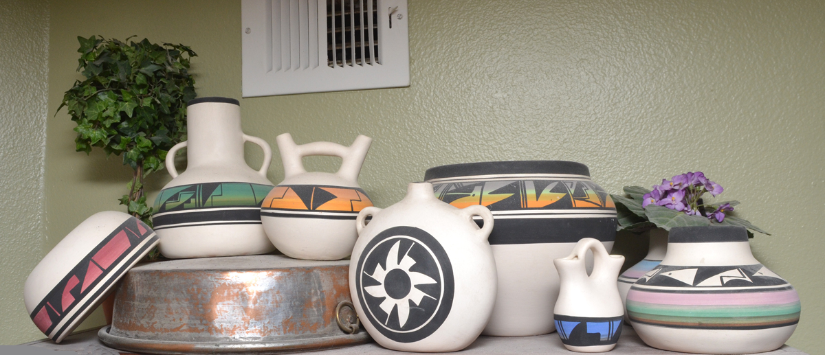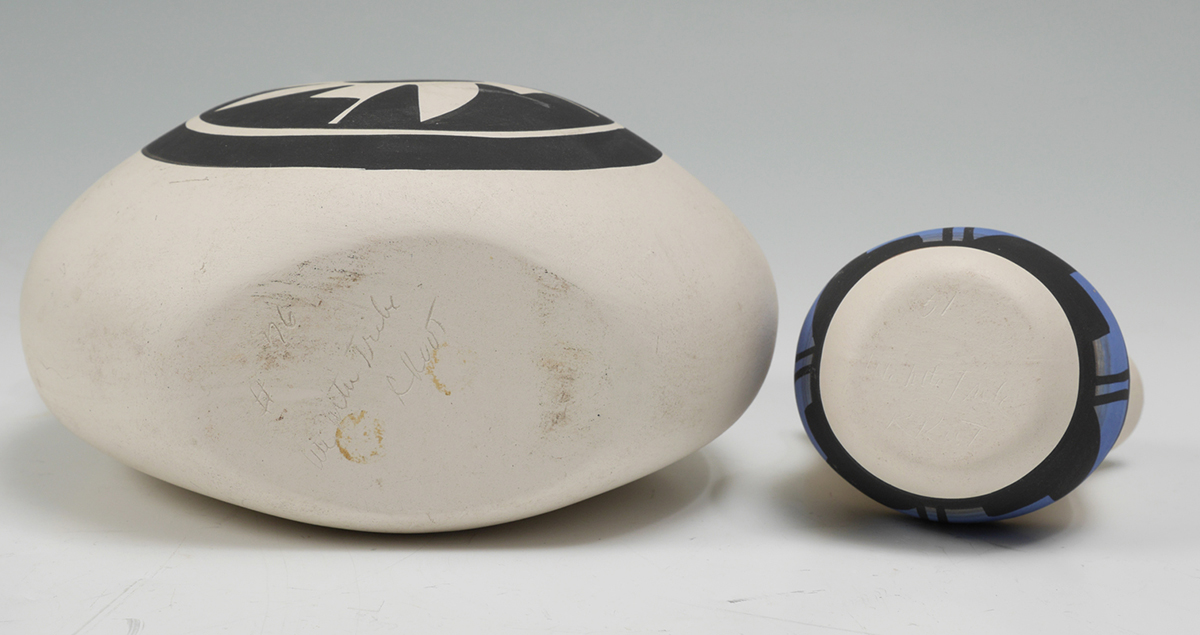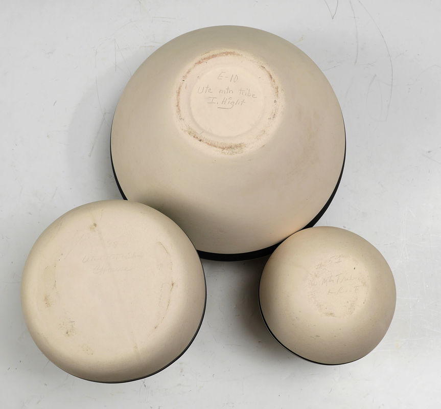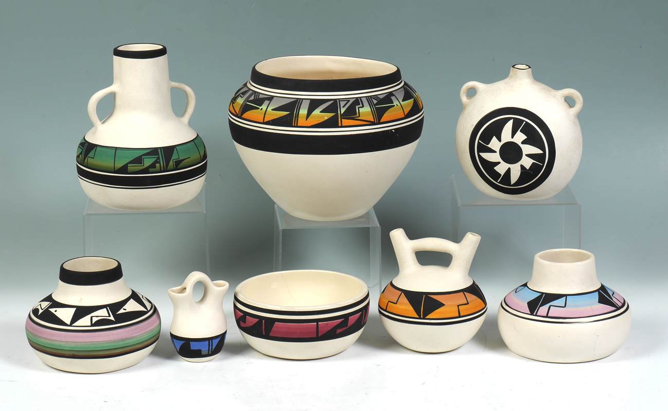 8 PIECE UTE TRIBE POTTERY COLLECTION: An assembled collection of 8 pieces by decorated by assorted artists of the Ute Indian tribe, largest olla form bowl measures 7 3/4'' h. x 9 1/4''.