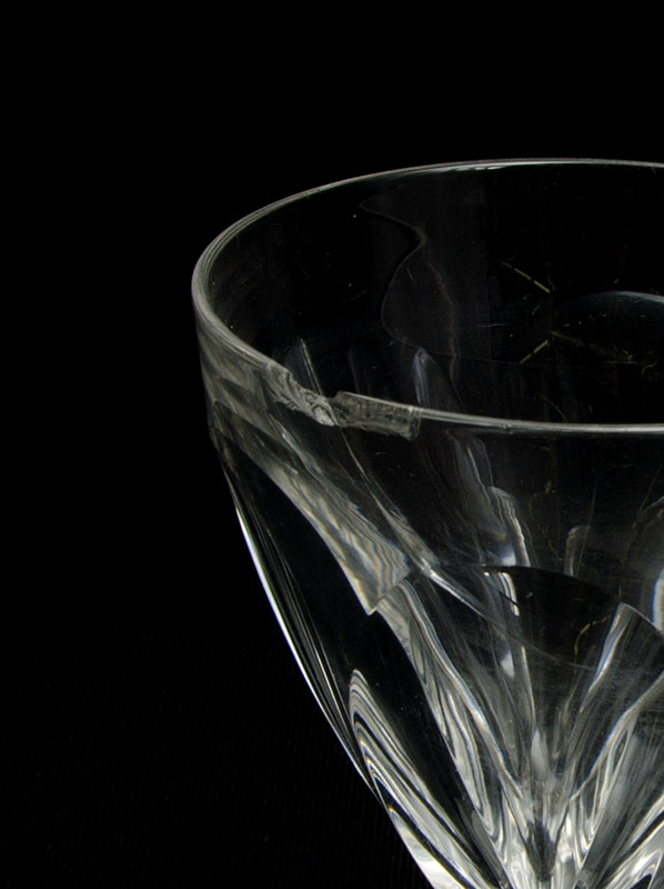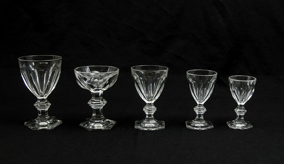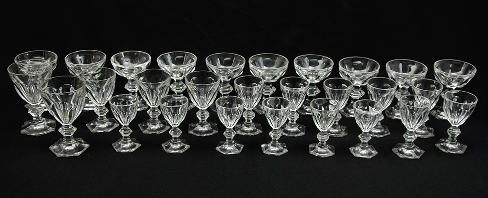 BACCARAT HARCOURT STYLE GLASS STEMWARE: Approx. 25 pieces in a pattern similar to Baccarat Harcourt, but unmarked, to include 2 water (6'' h.), 2 wine (5 3/8''), 7 wine (4 7/8''), 9 champagne (5 1/8''), 5 cordials (4 1/2'').