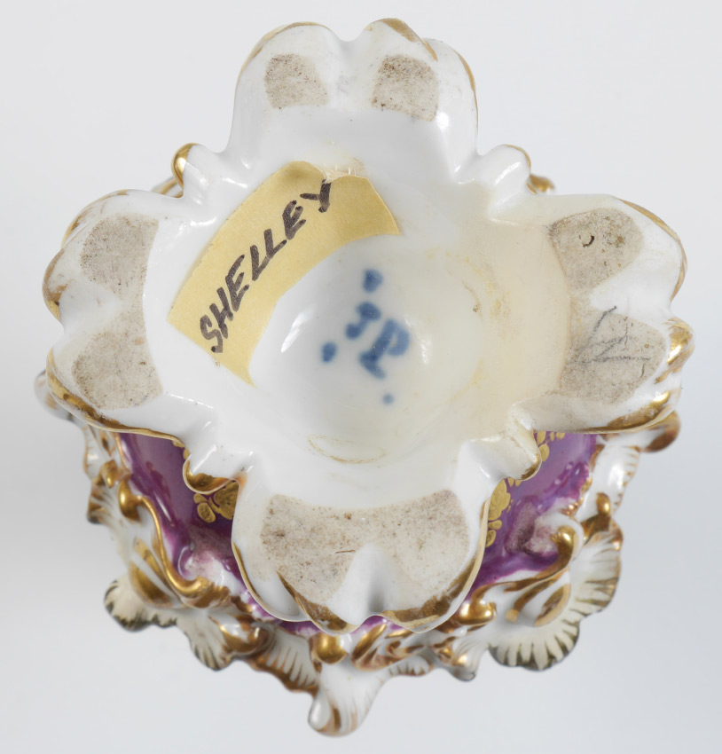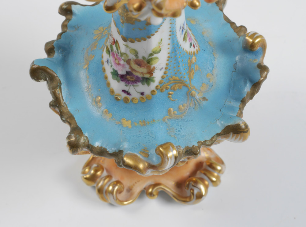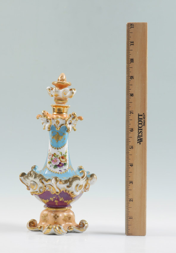 JACOB PETIT HAND PAINTED PORCELAIN PERFUME BOTTLE: 19th century, hand painted floral garland in reserves. Jacob Petit blue makers mark on base, overall measures 9 1/4'' h. x 4 1/2''.