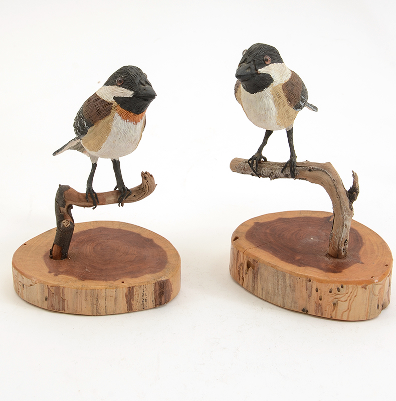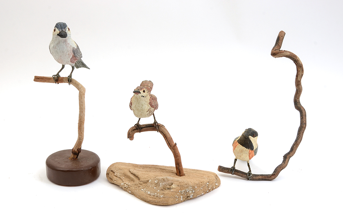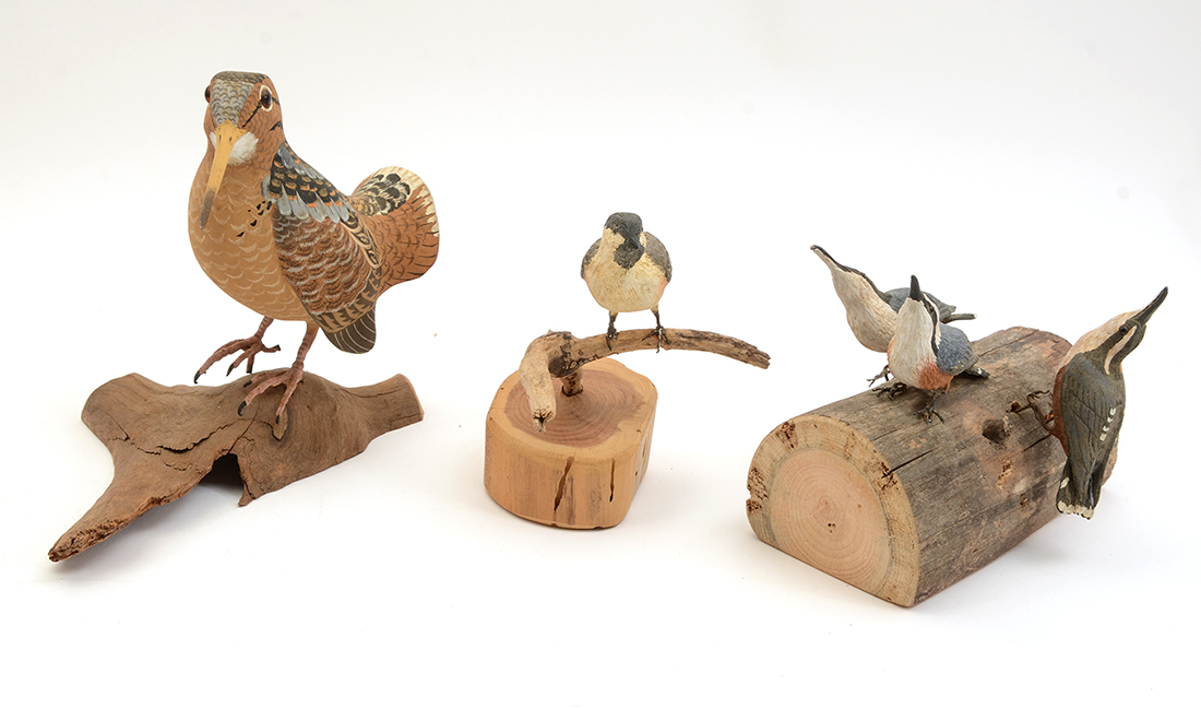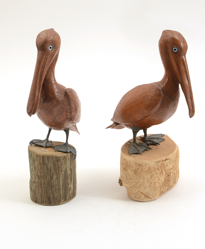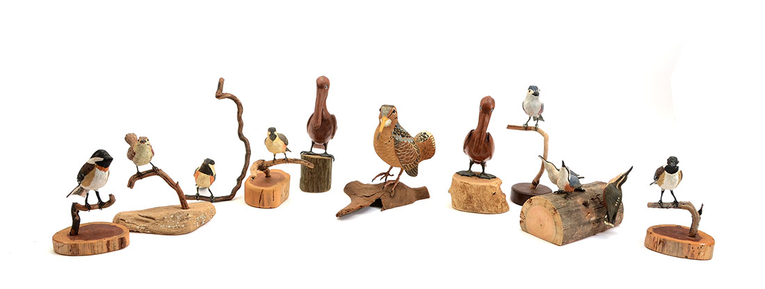 10 BOB LEE CARVED BIRDS: An assembled collection carved and painted birds from Florida artist Bob Lee to include sparrows, chickadees, shorebirds and more. Also include 2 unpainted pelicans. Largest bird measures 7 3/4'' x 10 1/2'' x 5''.