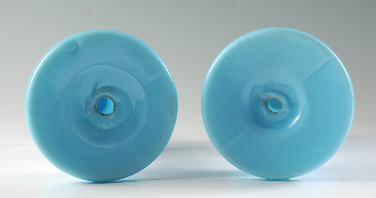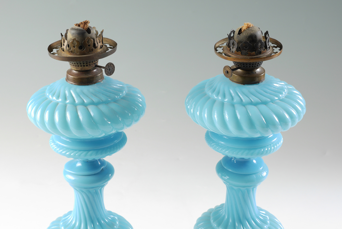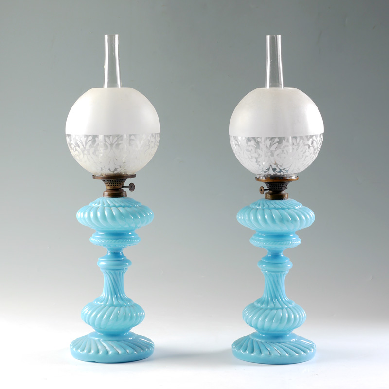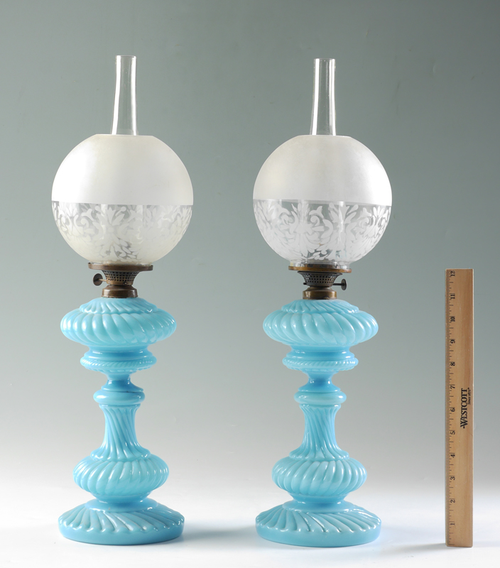PAIR OF BLUE OPALINE GLASS OIL LAMPS: Light blue opaline glass bodies, ribbed with alternating twist, 13 1/4'' h. x 5 1/2''. Sold with frosted glass globe shade, 6'' dia., and clear chimneys, 9 1/2'' h.