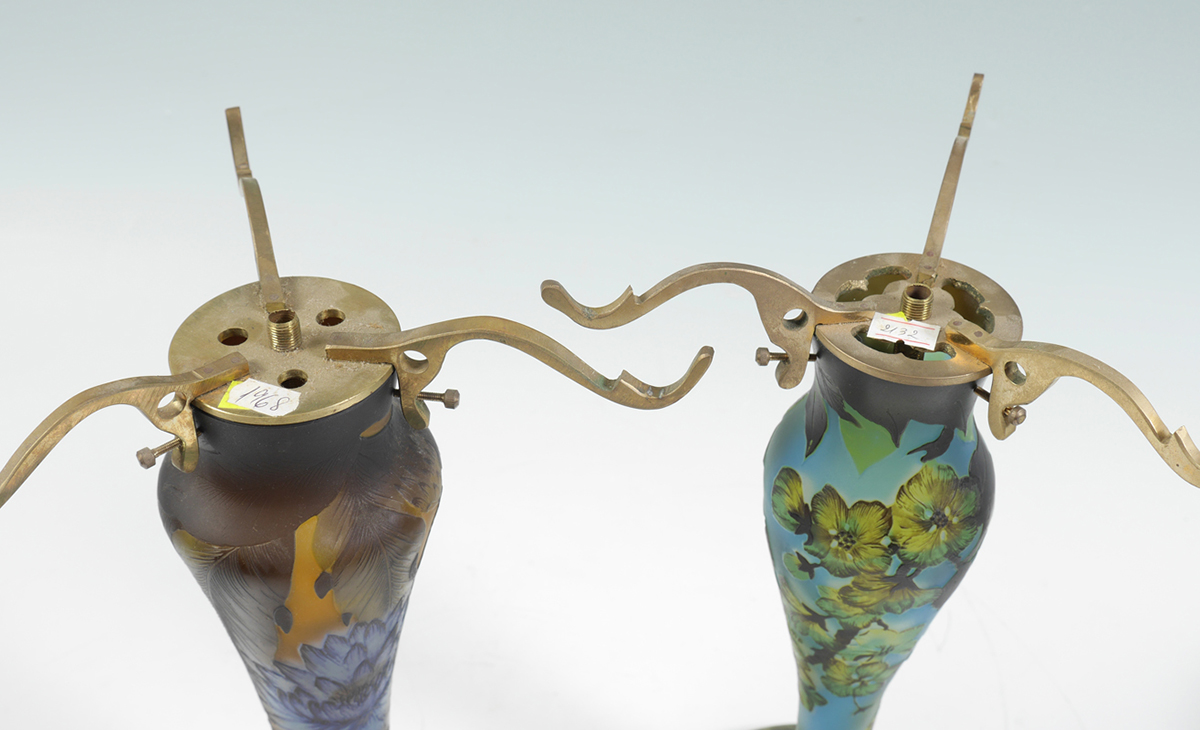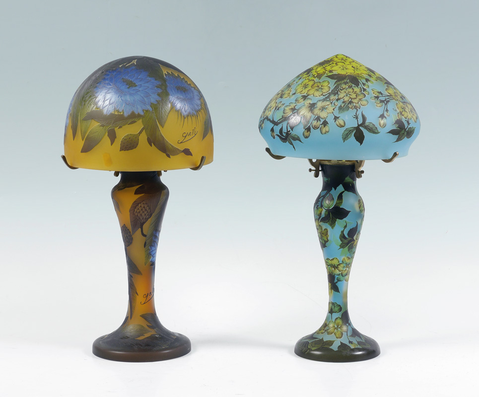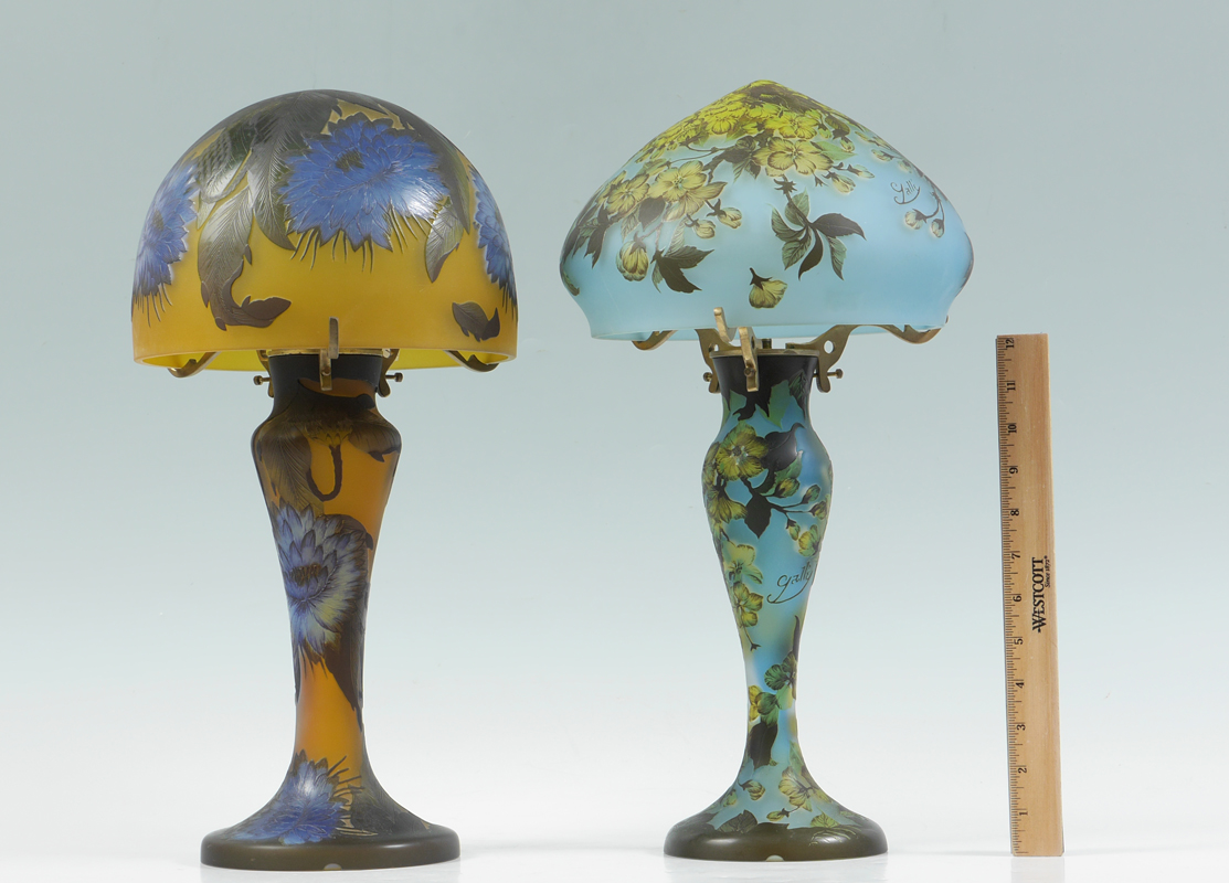 2 GALLE STYLE CAMEO CUT BOUDOIR LAMPS: 2 lamps each with spurious Galle signature to include 1) Blue ground with yellow flowers, base measures 13'' h. x 7 1/2''. Shade 6'' h. x 9 1/2'', fitter rim 8 1/2''. 2) Amber ground with blue chrysanthemums, base 12 3/4'' h. x 9''. Shade 6 3/4'' h. x 9''