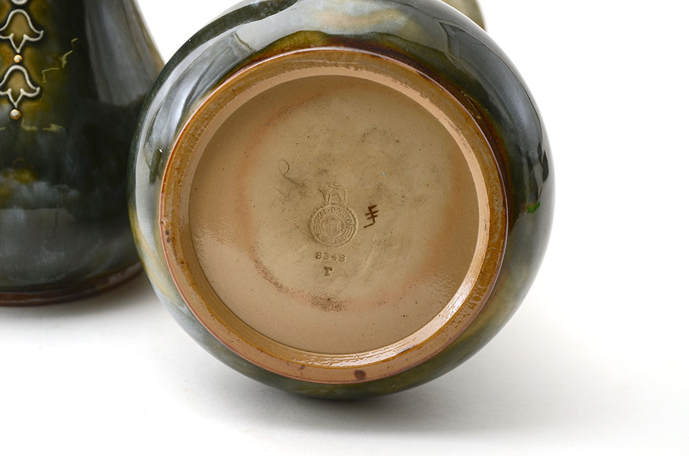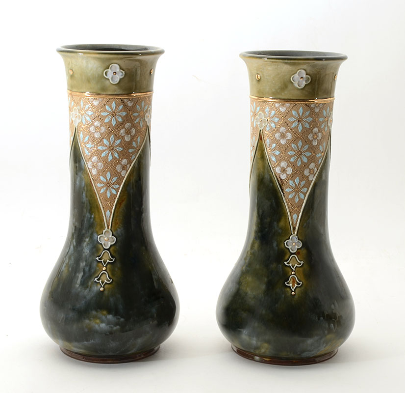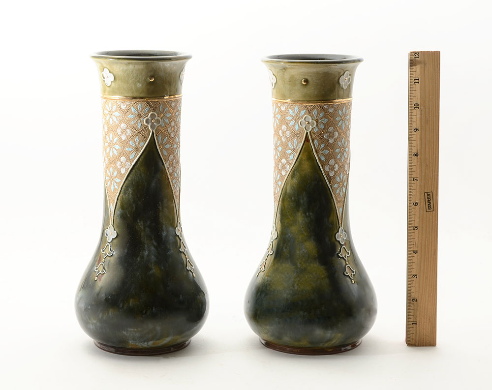 PAIR ROYAL DOULTON TAPESTRY VASES: Circa 1923-1927, mottled green glaze ground, floral tapestry decoration, applied bellflower, well marked on base. Overall 12'' h. x 5 1/2''.