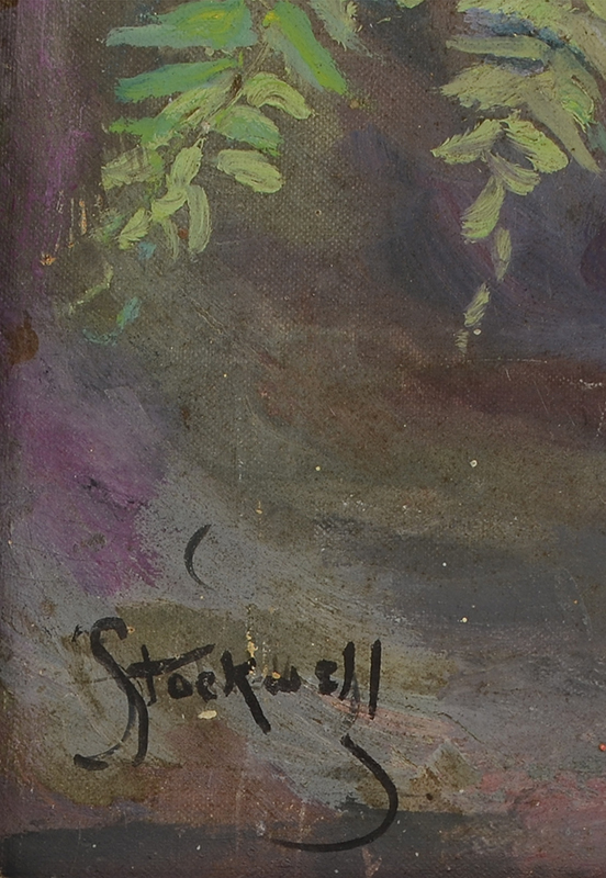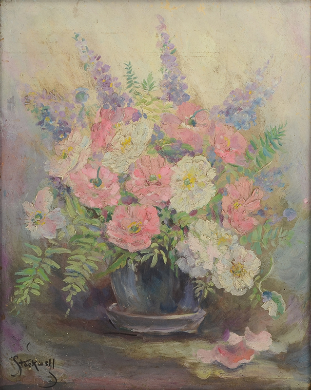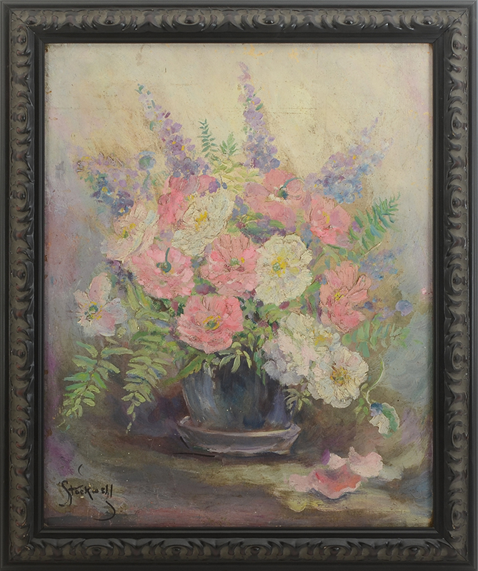 STOCKWELL, Catherine (American, 1895-1983): Cherokee Rose Floral Still Life Painting, Oil/Canvas board, 20'' X 16'', signed lower left, framed, 23.25'' X 19.25''. Catherine Stockwell painted many Florida scenes but as she would travel up north for the summer she would also capture many New England scenes.