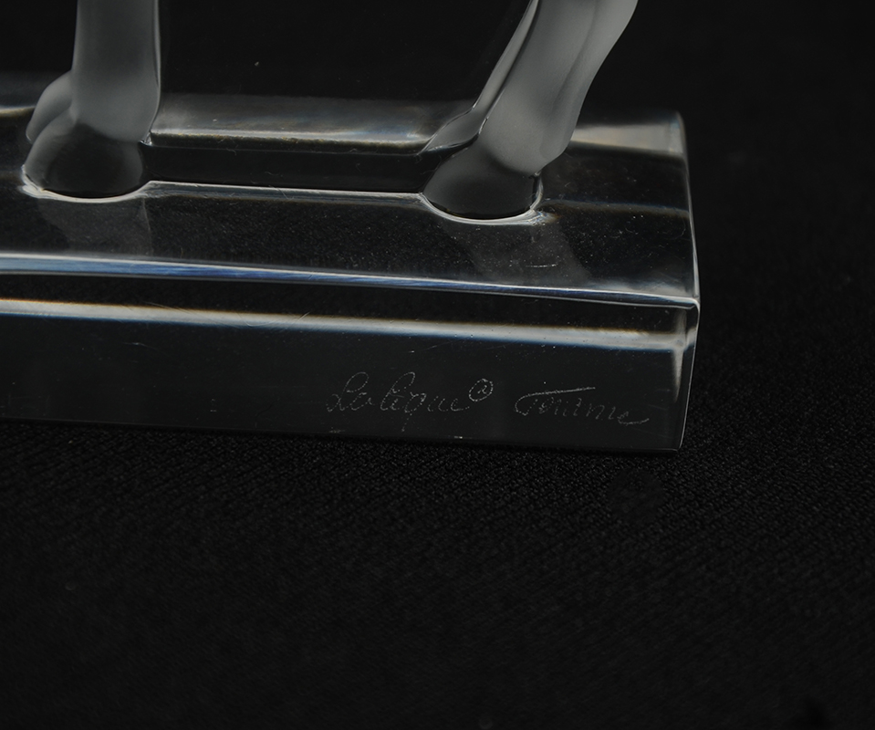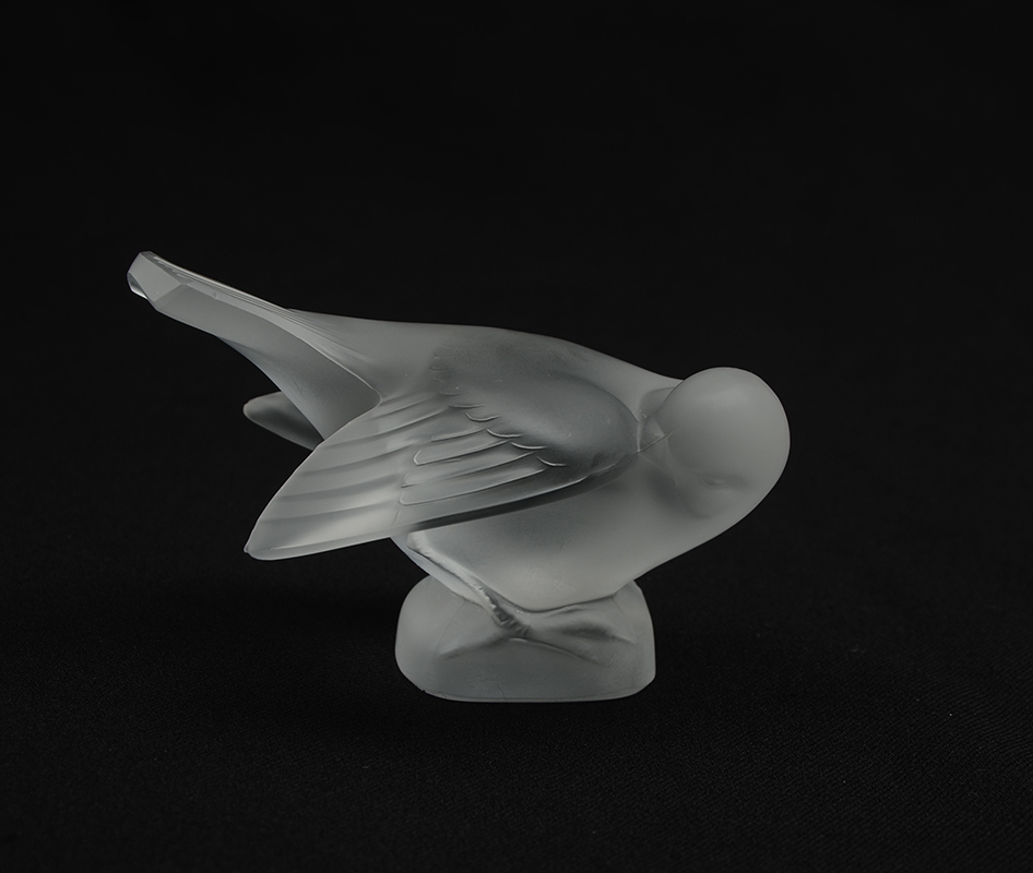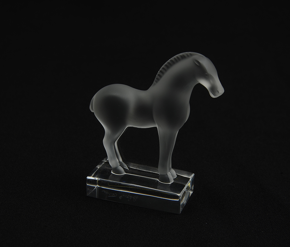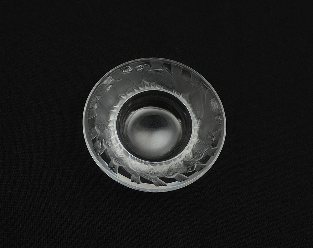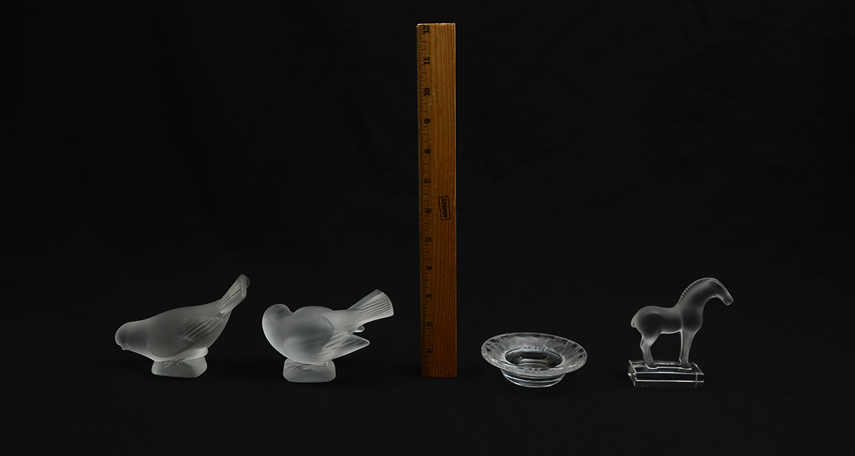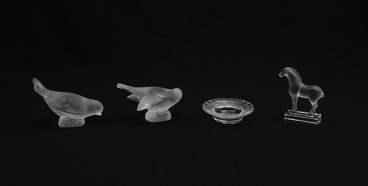 4 PIECE LALIQUE CRYSTAL ITEMS: 4 pieces total to include 1-2) Sparrow figural paperweights, on with head down, the other with head tucked, 3 1/2'' h. x 4 3/4''. 3) ''Cheval'' horse paperweight, 4''. 4) Ring tray, rim with figural sparrow, 1'' h. x 3 3/4'' dia.