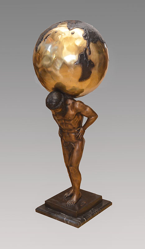 BRONZE SCULPTURE OF ATLAS WITH GLOBE: Contemporary decorative figure of Atlas with the world on his shoulders, no visible signature, affixed to marble base, overall measures 38 1/2'' h. x 14''.
