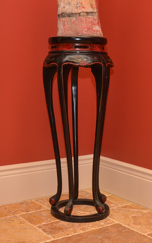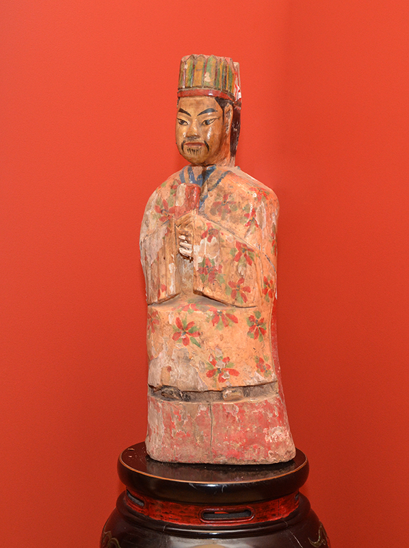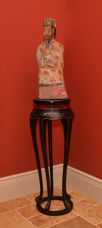 POLYCHROME CARVED CHINESE SCHOLAR: Polychrome paint decorated figure of a scholar holding a scroll, overall measures 26'' h. x 10 1/2'' x 6 1/2''. Sold with an ebonized plant stand 39 1/2 h. x 16'' dia.