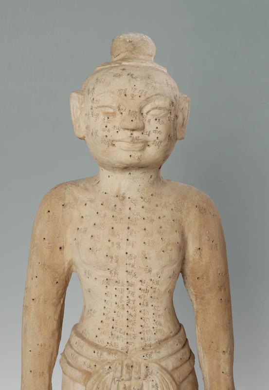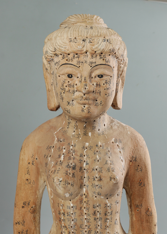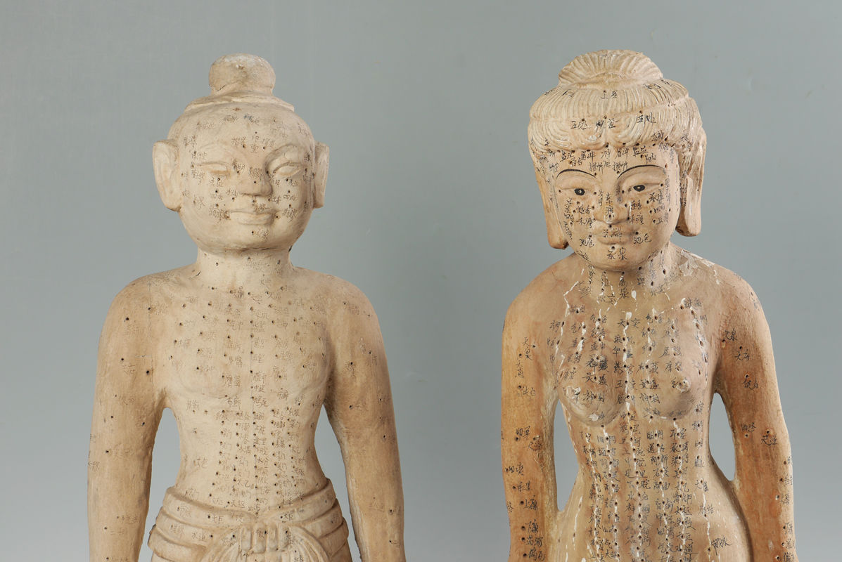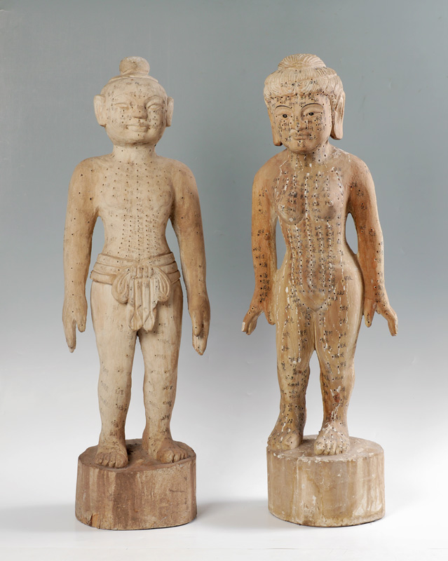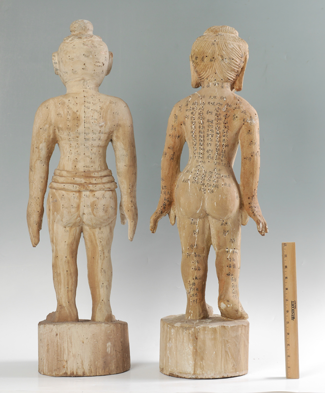 PAIR CHINESE CARVED ACUPUNCTURE MODELS: Carved wood male and female figures, holes diagram acupuncture points with Chinese characters. Each measures approx. 32'' h. x 11 1/4''.