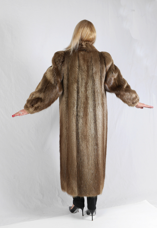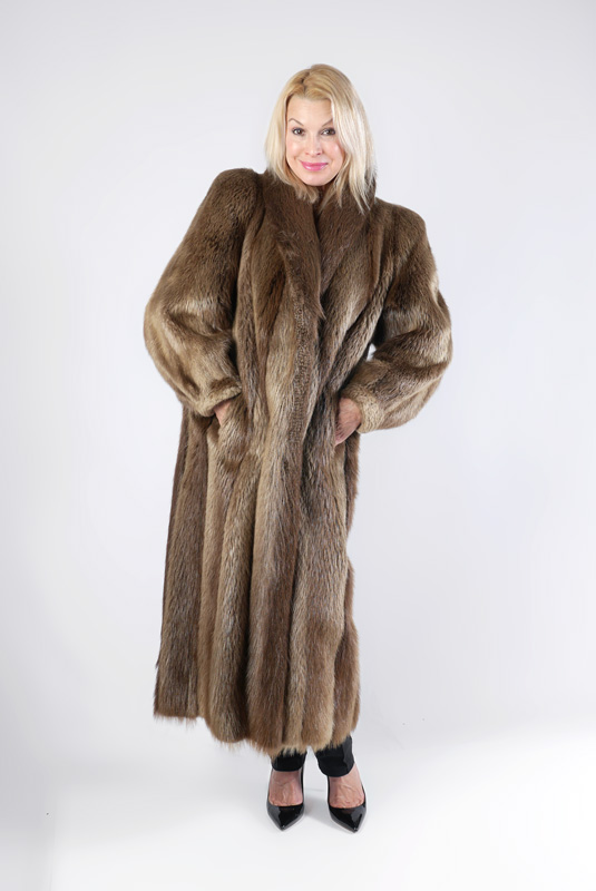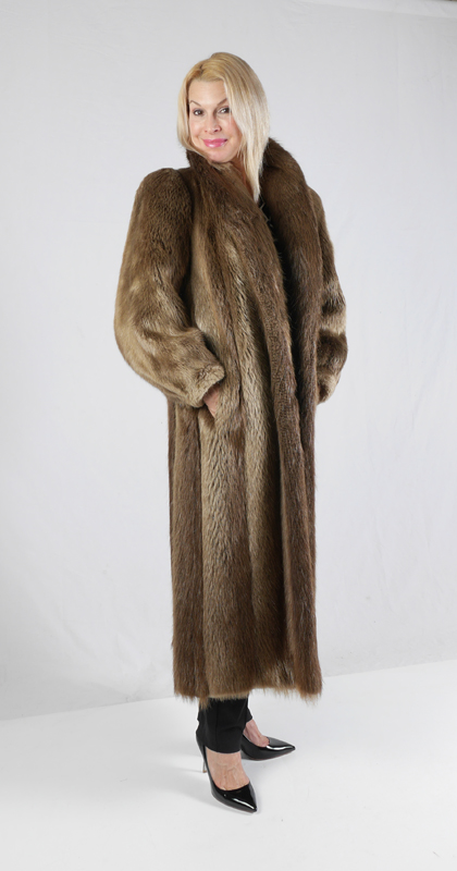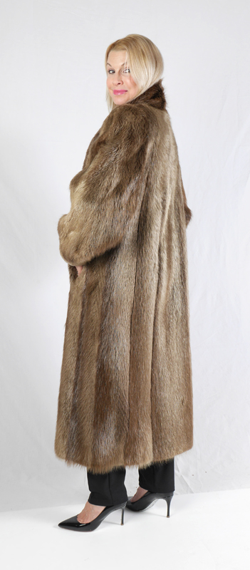 FULL LENGTH BROWN FUR COAT: Full length, fully lined fur coat with stand up collar is in good condition. Length is 51'' from the shoulder to the hem, 14'' from shoulder to shoulder and 25'' from shoulder seam to arm cuff. 3 fur hook closures.
