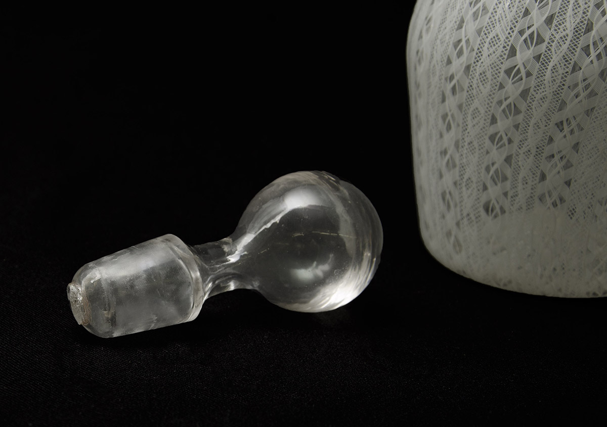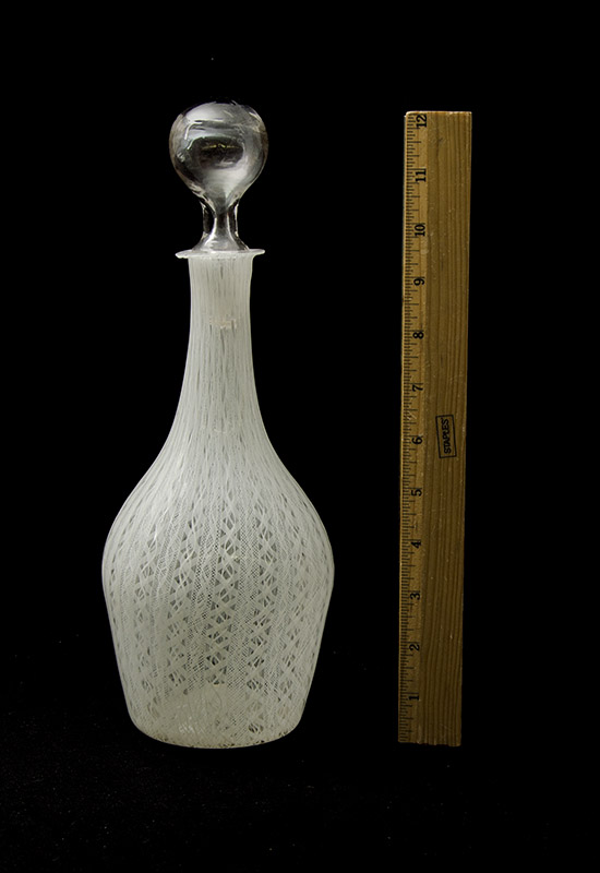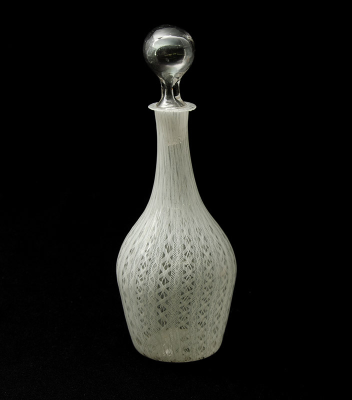 MURANO WHITE LATTICINO GLASS DECANTER: Delicate glass decanter with white latticino design, clear glass stopper, overall 12 1/4'' h. x 4 1/2''.
