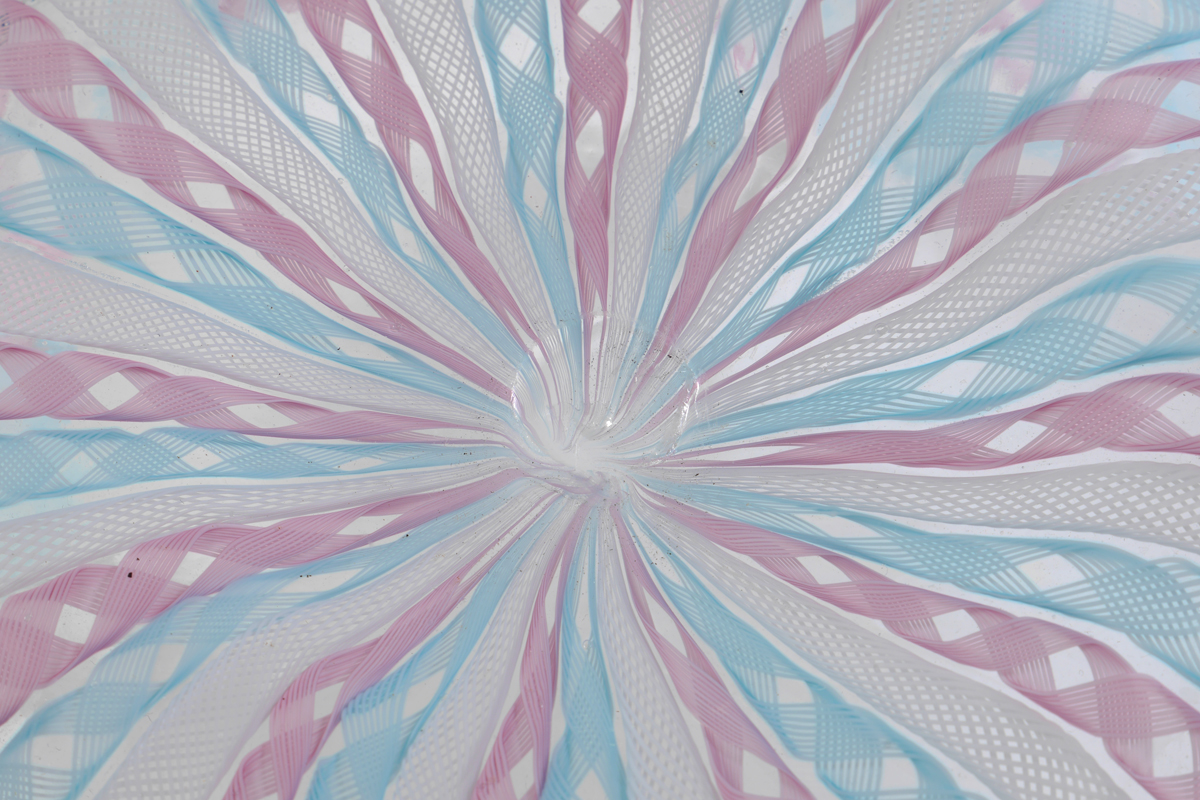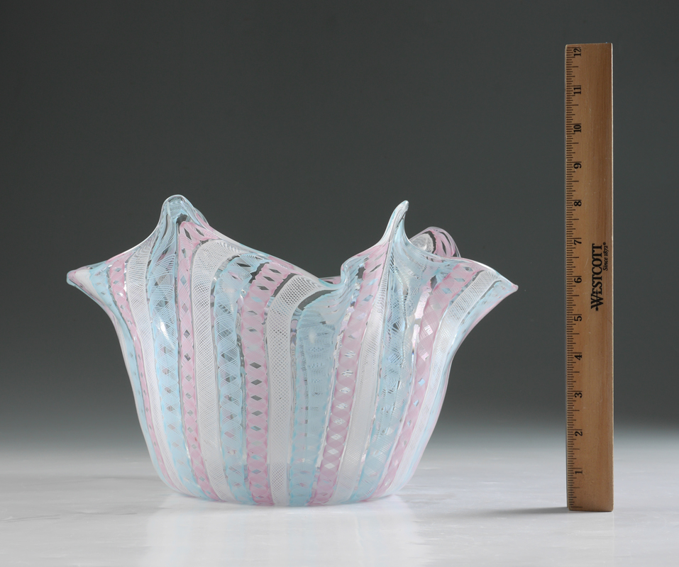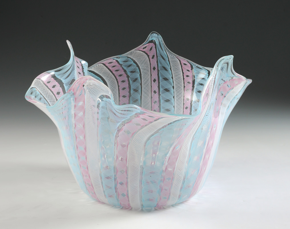 MURANO LATTICINO GLASS HANDKERCHIEF VASE: Free form rim, alternating blue, pink and white latticino bands, unmarked. 8 1/4'' h. x 12 3/4'' dia.