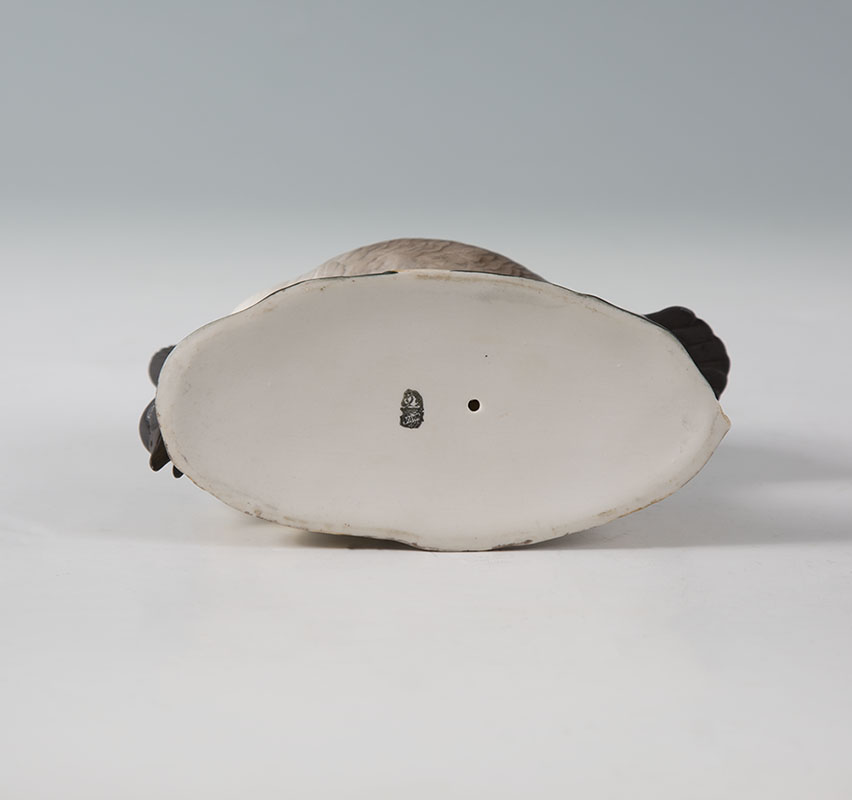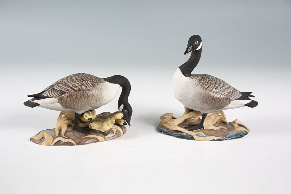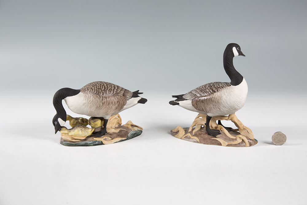 PAIR OF BOEHM PORCELAIN GEESE FIGURINES: 2 pieces total, each with Boehm markings on base to include 1) Goose with head up, 6 1/2'' h./ x 6 1/2'' x 3''. 2) Mother goose with 3 goslings, 4'' h. x 7'' x 3 1/4''.