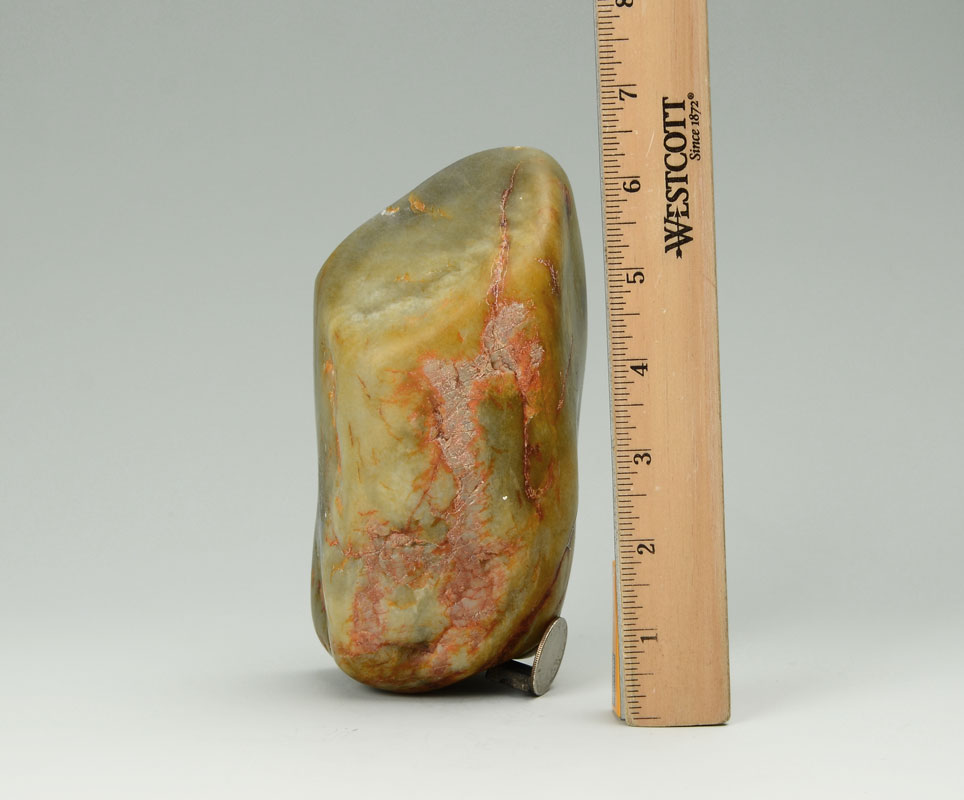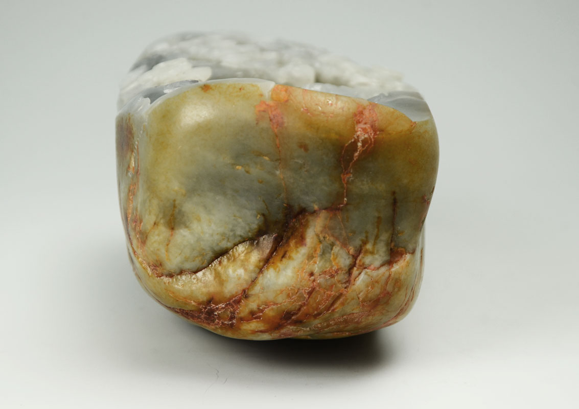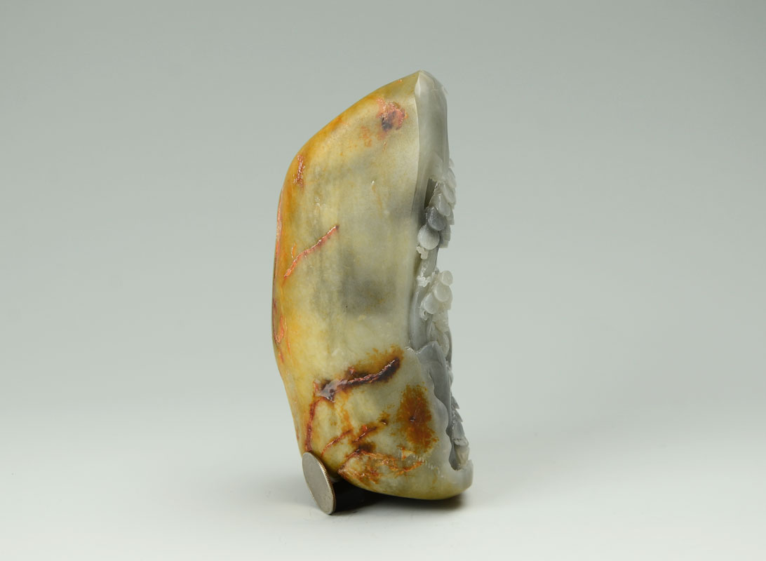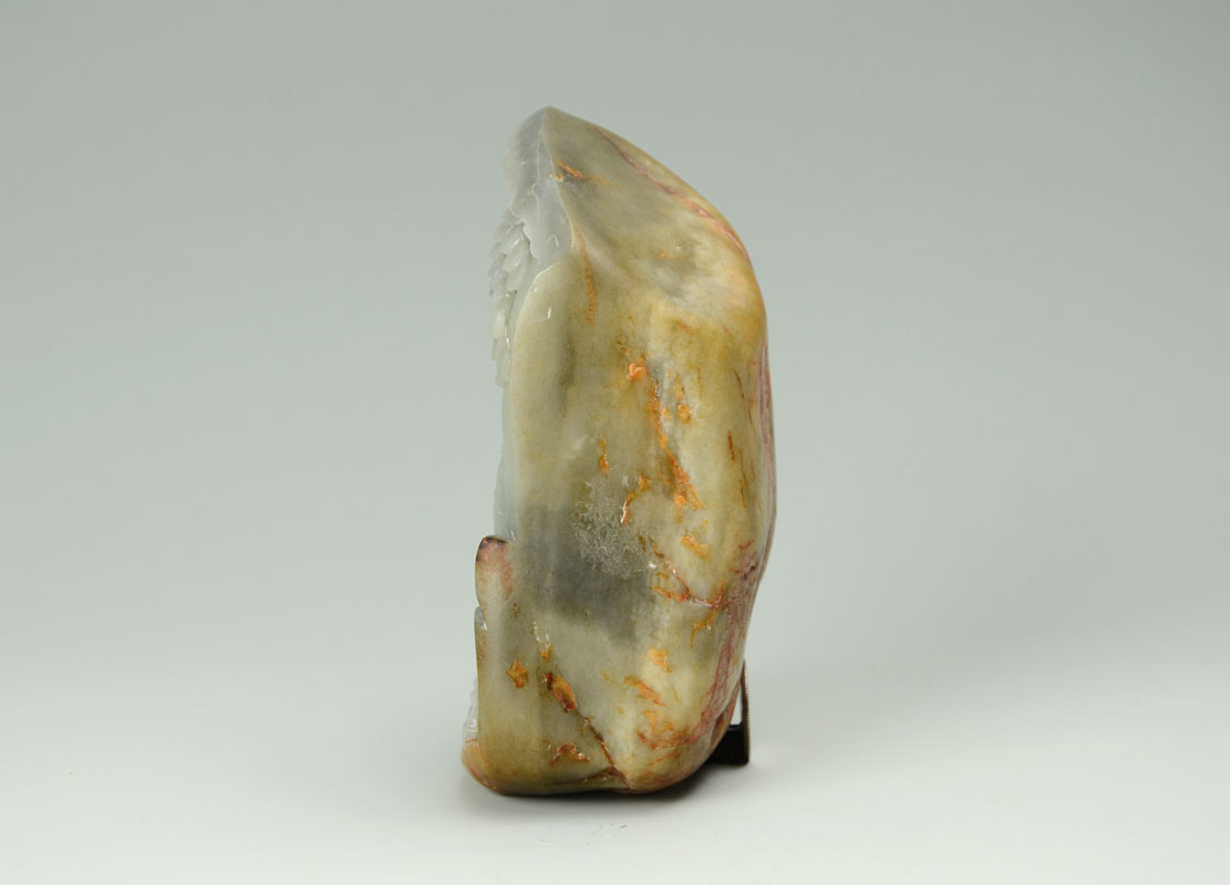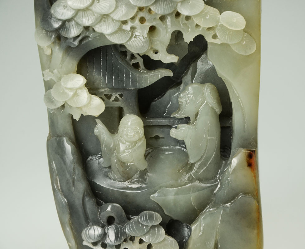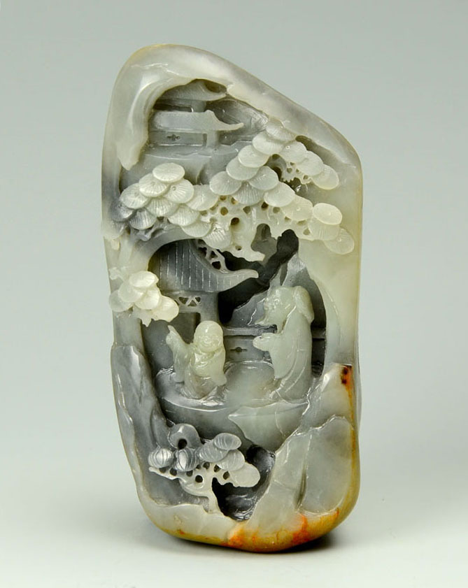 CHINESE CARVED HETIAN JADE SCHOLARS MOUNTAIN BOULDER: Carved jade with grey/black skin, figures of scholar and attendant in mountain landscape with buildings and trees. Overall measures 6'' h. x 3 1/4''.
