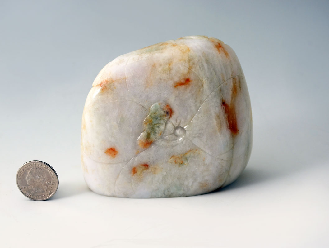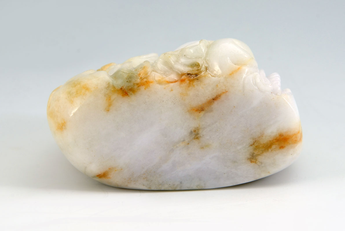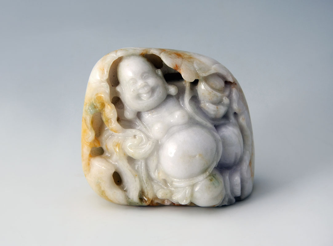 CHINESE CARVED JADEITE BUDDHA BOULDER: Carved white, apple and brown jadeite or similar stone figure of a happy seated Buddha or Hotei, measures 3 1/2'' h. x 4'' x 2 1/2''.