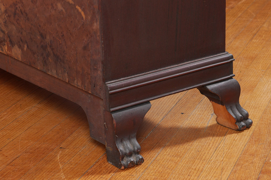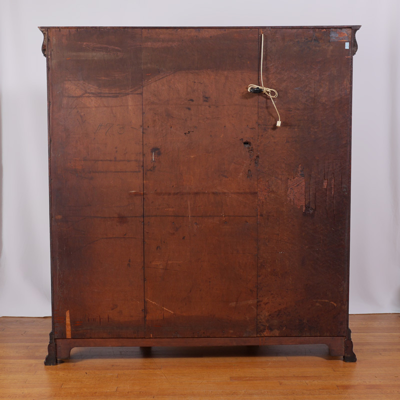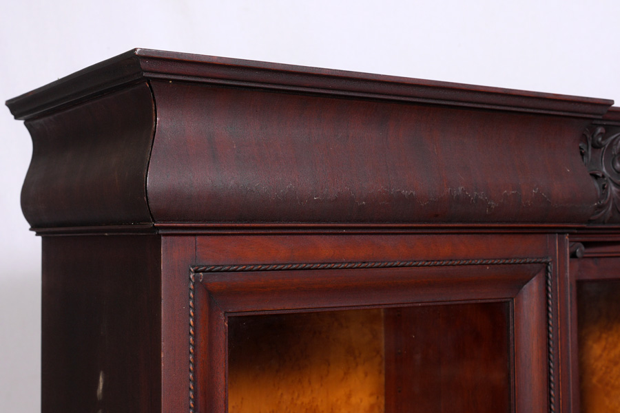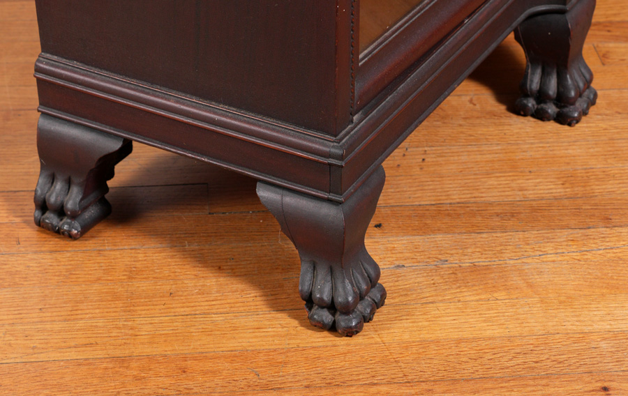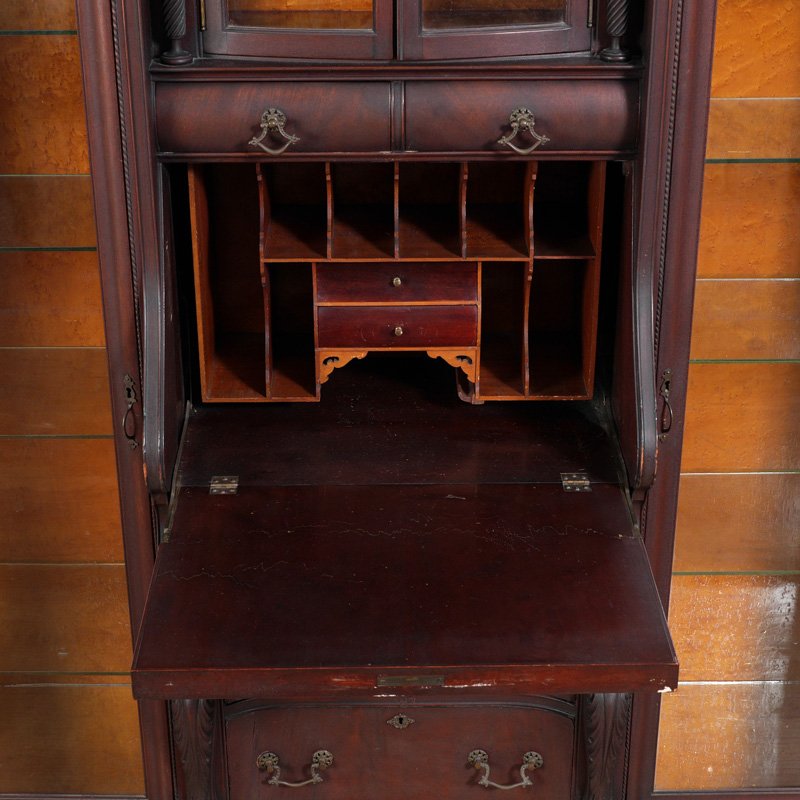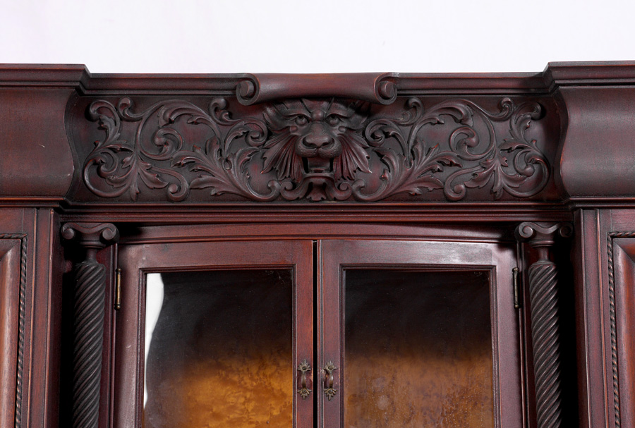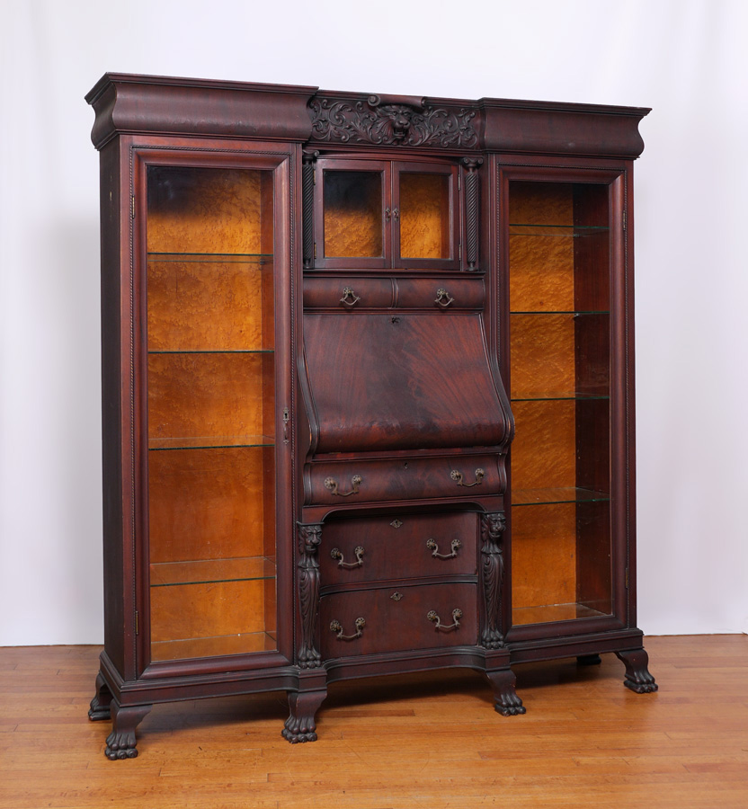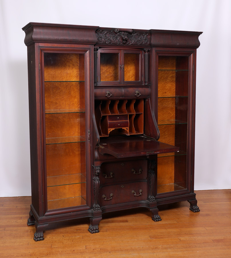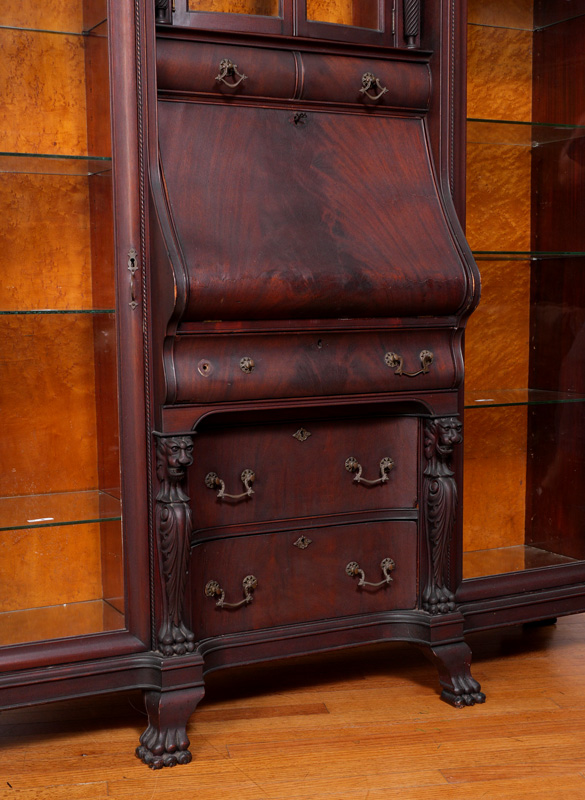 VICTORIAN MAHOGANY TRIPLE SECTION BOOKCASE: Shaped pediment with carved foliate and lion masqueron center panel. Center section with 2 glass doors over 2 drawers, fall front center secretary, 3 drawers with figural lion decoration. Flanked on either side with glass doors, 5 glass shelves, maple veneer backs. All on paw feet. 68 1/4'' h. x 63 3/4'' x 14 1/2''.