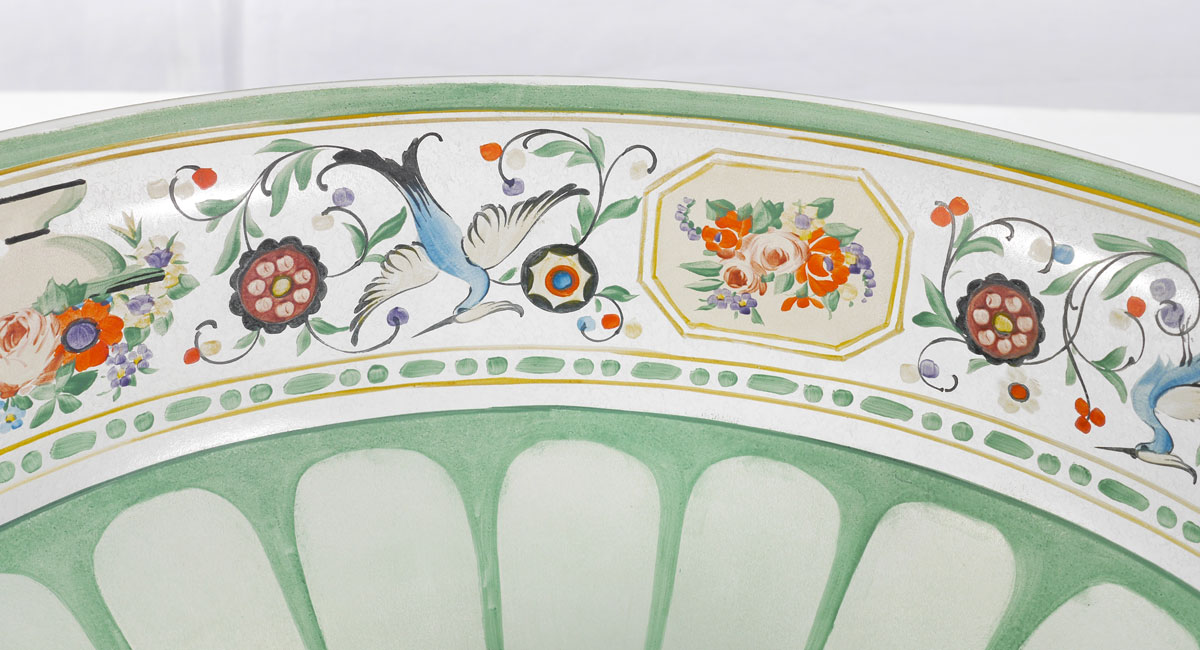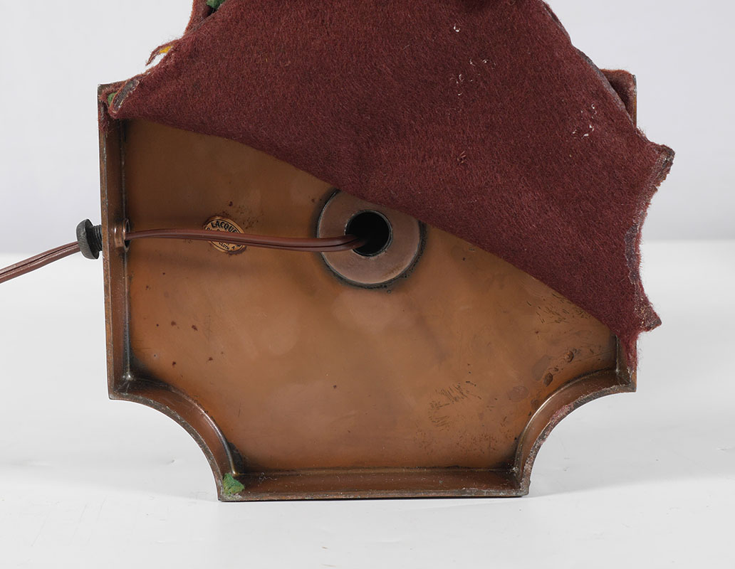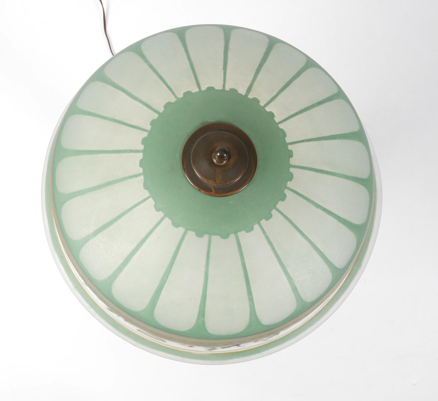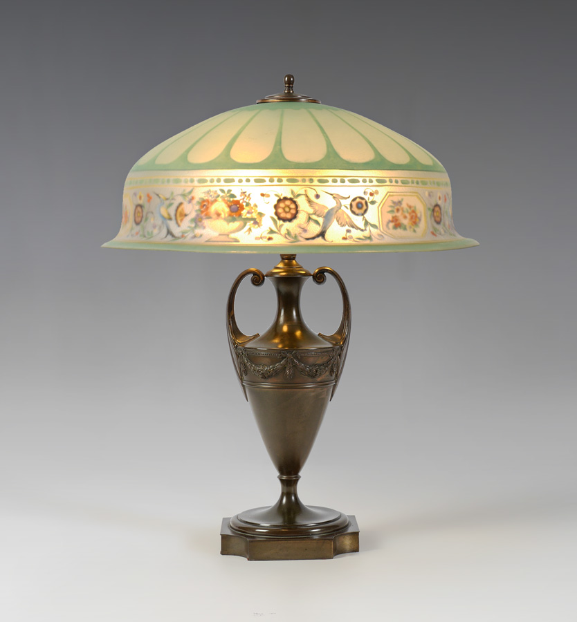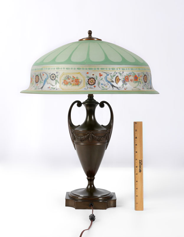 PAIRPOINT REVERSE PAINTED LAMP: Patinated metal urn form base marked Pairpoint, D3016, 3 socket fixture, measures 25 1/4'' x 7 1/4''. Molded reverse painted shade with bird, floral and urn motif band, 7 1/2'' h. x 20'' dia, fitter rim 2 3/4''.