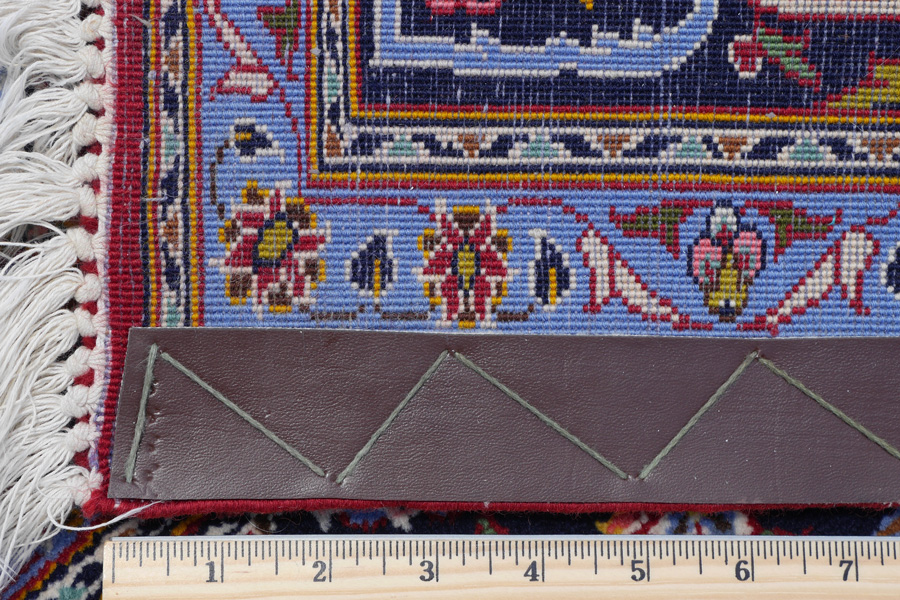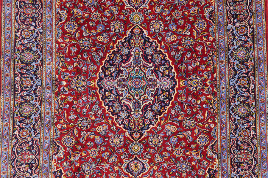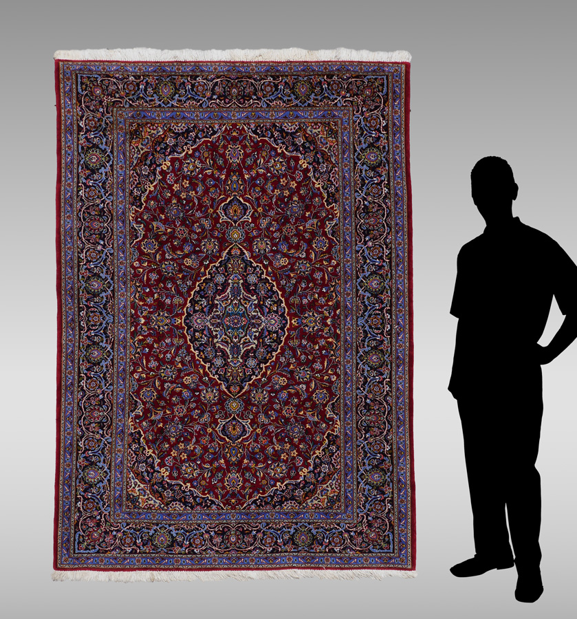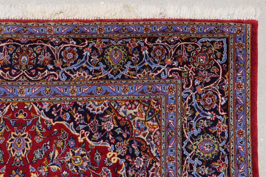 SEMI-ANTIQUE PERSIAN KASHAN HAND KNOTTED WOOL RUG, 5' X 7': This very finely woven rug shows a real artistry in the use of colors with a well-drawn design. The dark blue oval central medallion has spandrels at each end and palmettes on each side. The medallion really stands out on the red field because of the white and yellow outlining which is also used to define the corners of the field. The rest of the field is covered with sprays of flowers linked to leaves, palmettes, and larger single flowers by sinuous vines. The many shades of blue borders do a beautiful job of completing this lovely rug. This rug was given an appraised value of $12,000 in the 1990's.