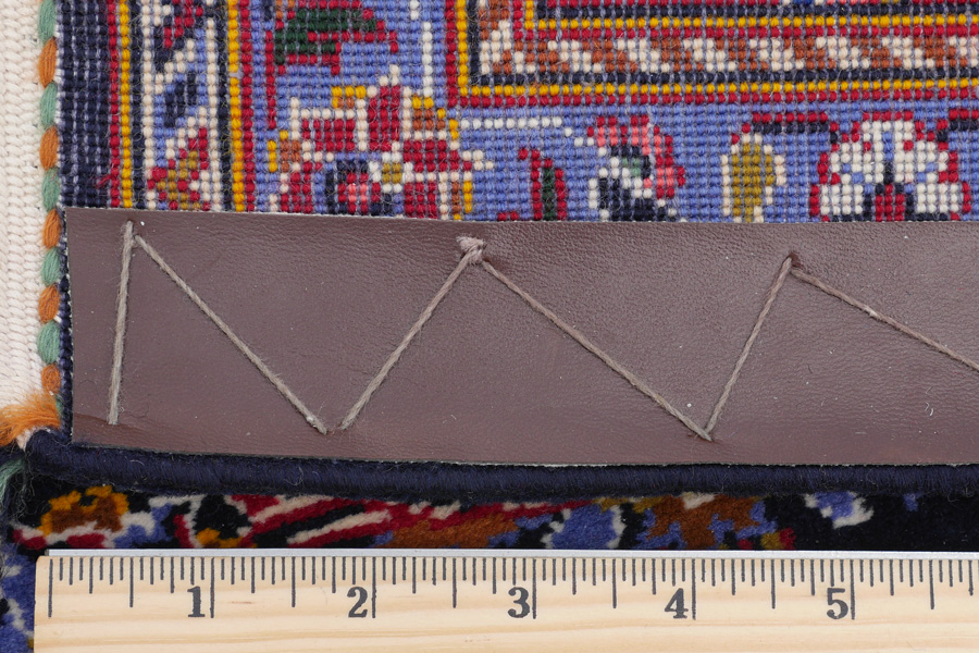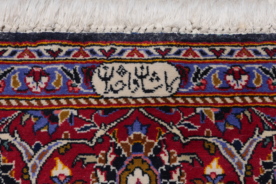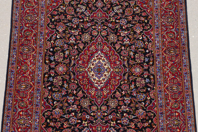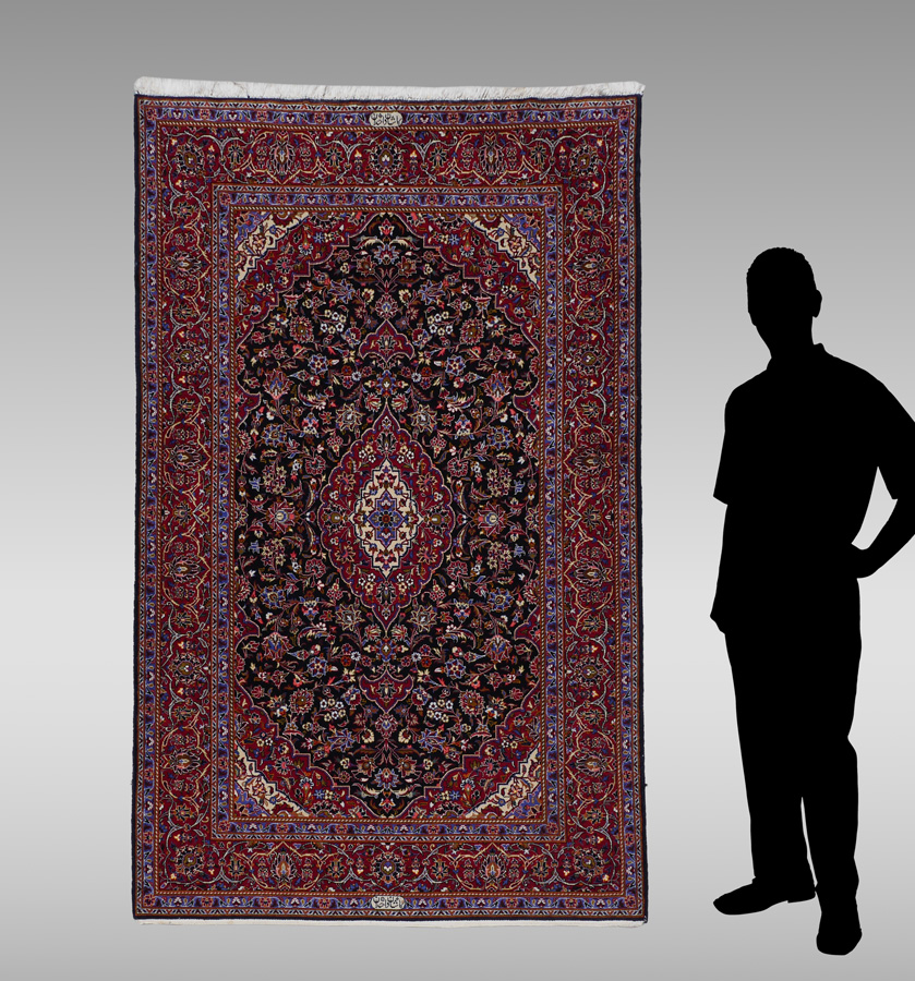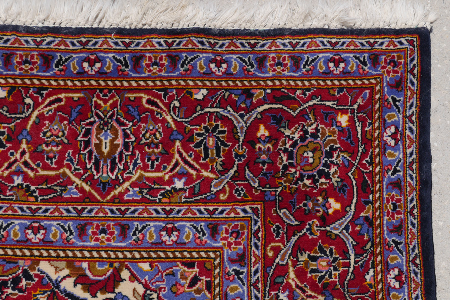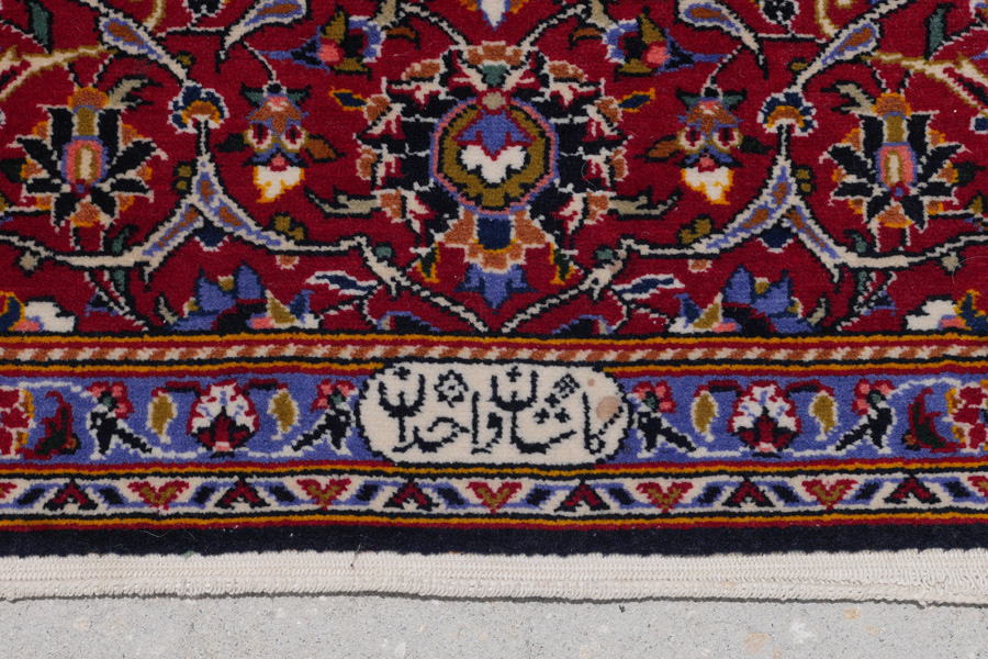 APPROX 35-55 YR OLD PERSIAN KASHAN HAND KNOTTED WOOL RUG, 4'7''X 7'1'': This good-looking Kashan rug is finely knotted with a beautiful design and well-chosen colors. Also, it has signature cartouches at each end signifying the maker Vehaden? and the point of origin, Kashan, Persia (Iran). The large central medallion has a red outer area around a white and pale blue center. The red, white, and blue corners of the field are like quarters of the central medallion. The field is covered with mostly individual flowers, some small sprays, some linked by vines. These motifs really stand out on the deep blue field. A wide red ground main border is flanked by pale blue and white guard borders. This rug was appraised at $10,500 several years ago!